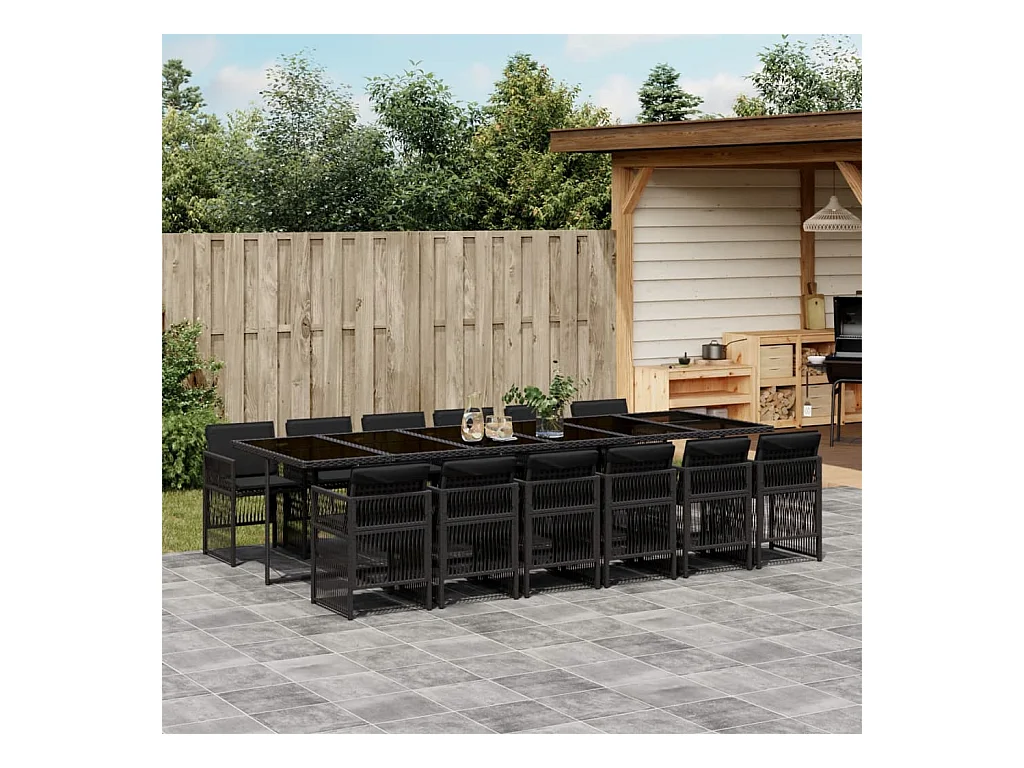Juego de comedor de jardín de 13 piezas con cojines negros de mimbre de resina