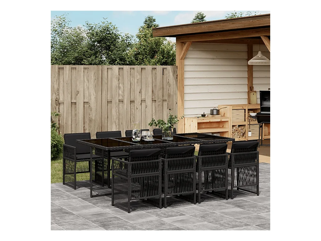 Juego de comedor de jardín de 9 piezas con cojines negros de mimbre de resina
