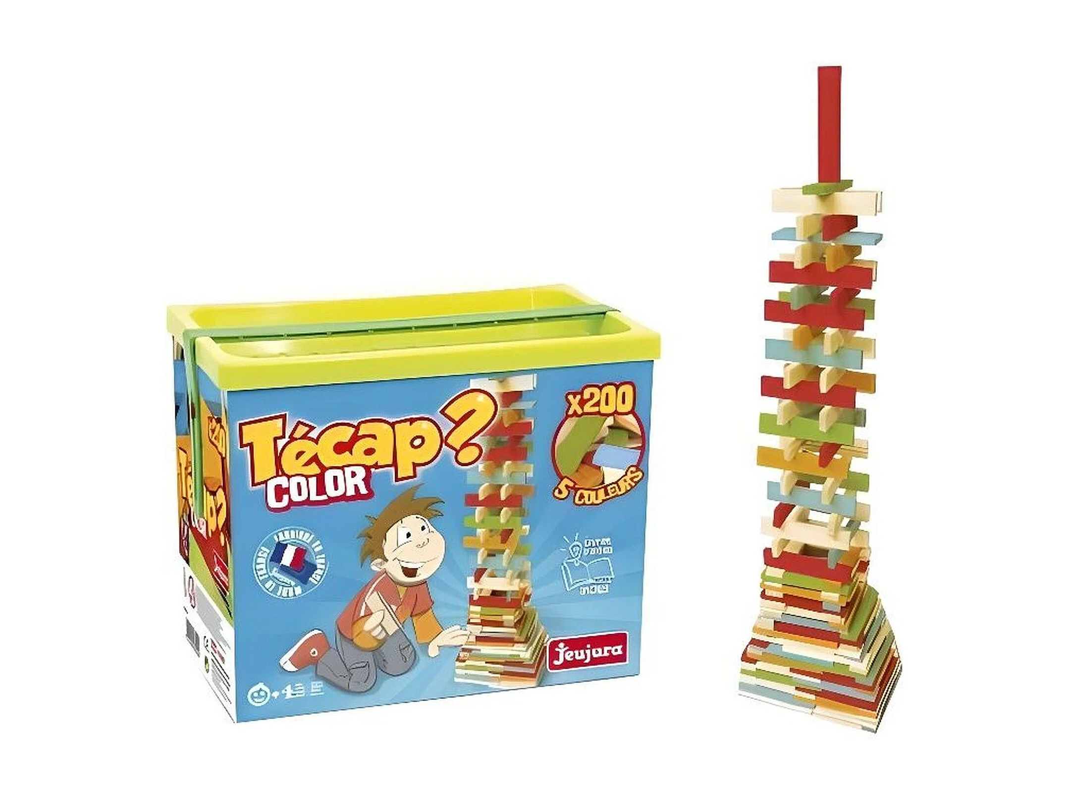 Juego de construcción en madera natural y teñida Técap Color 200 piezas – equilibrio y creatividad, barril multicolor verde y naranja