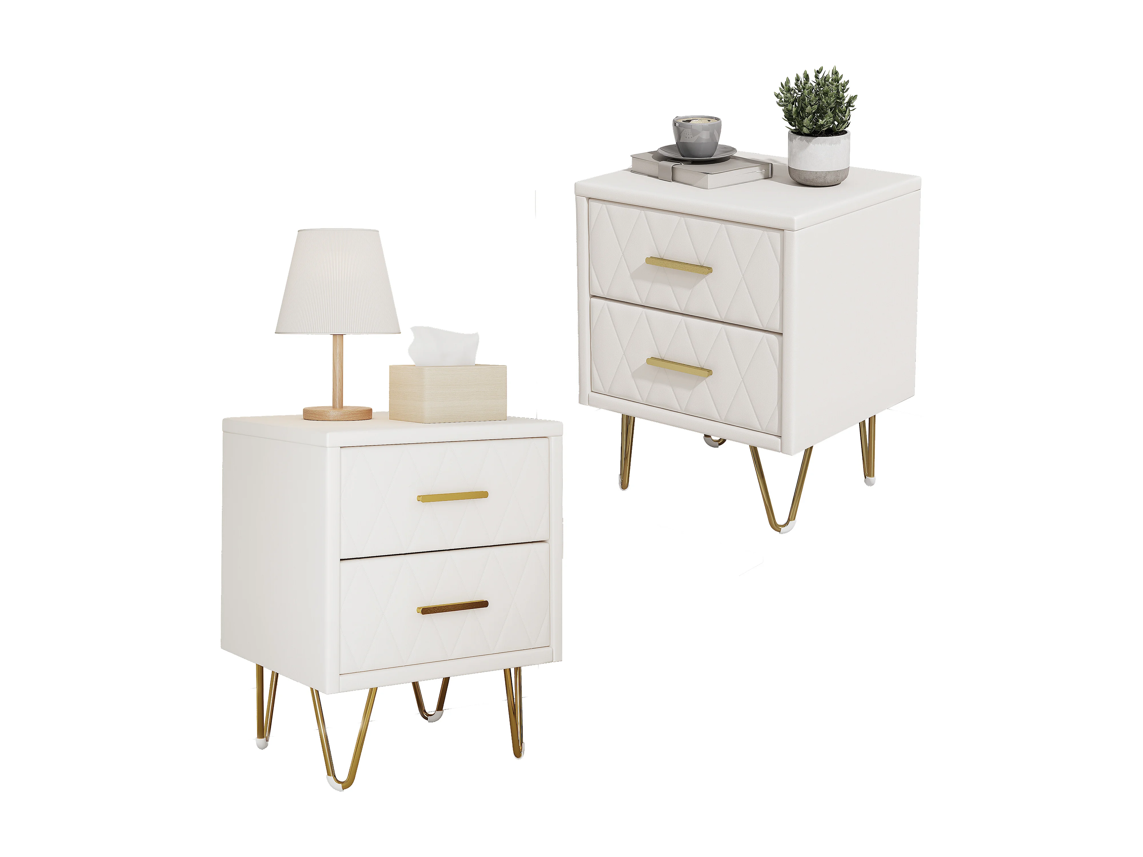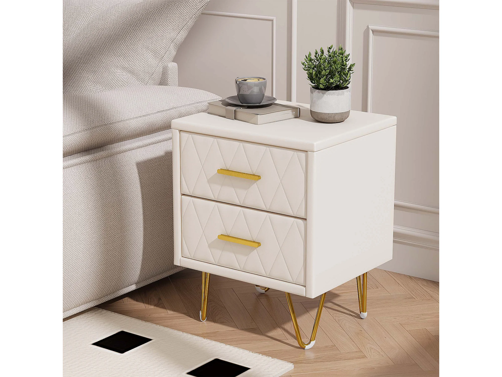 Juego de dos mesitas de noche modernas de piel sintética con dos cajones y patas metálicas doradas, 41 x 35,5 x 51 cm, color beige.