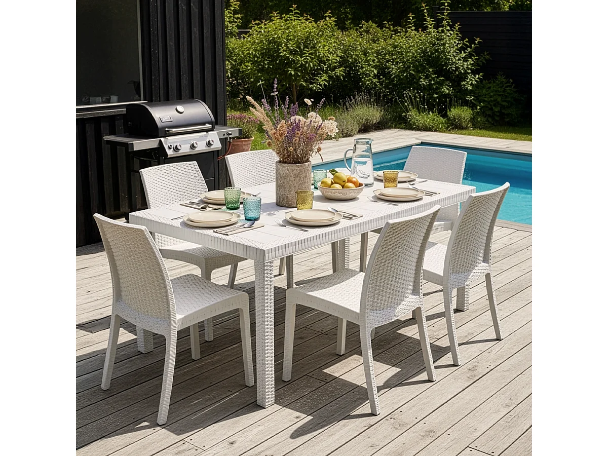 Juego de exterior de jardín compuesto por 1 mesa efecto ratán de 150x90 cm y 6 sillas color blanco Meloria Light