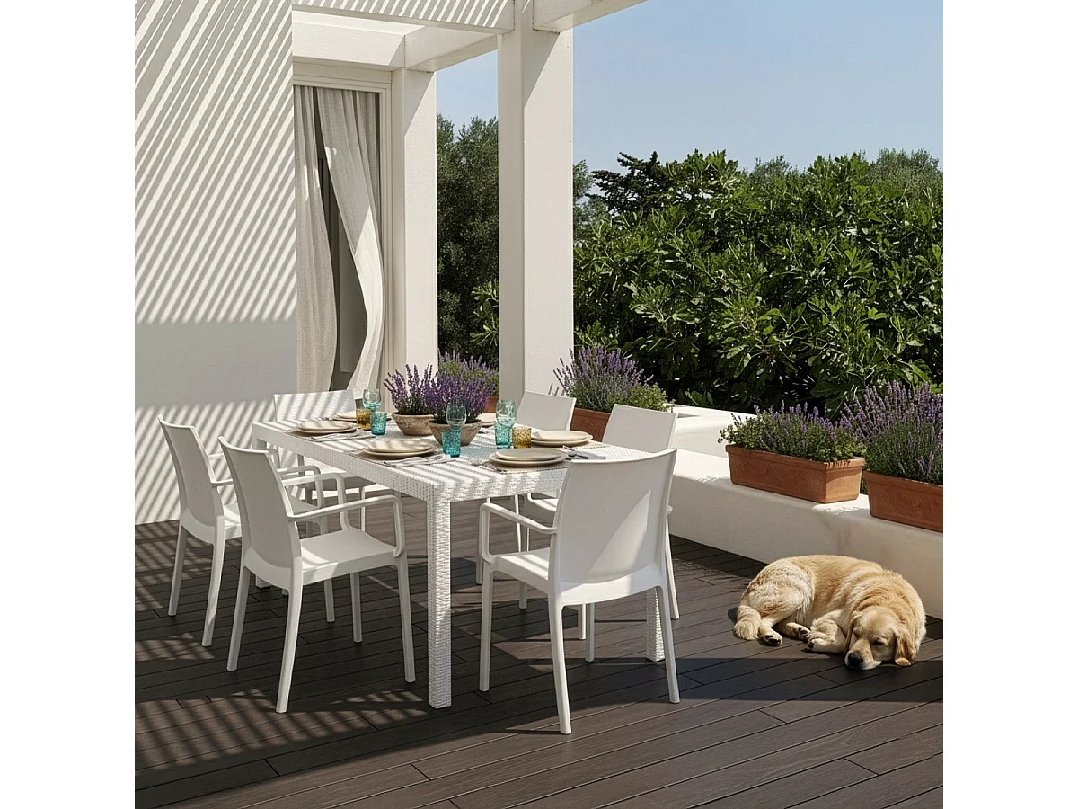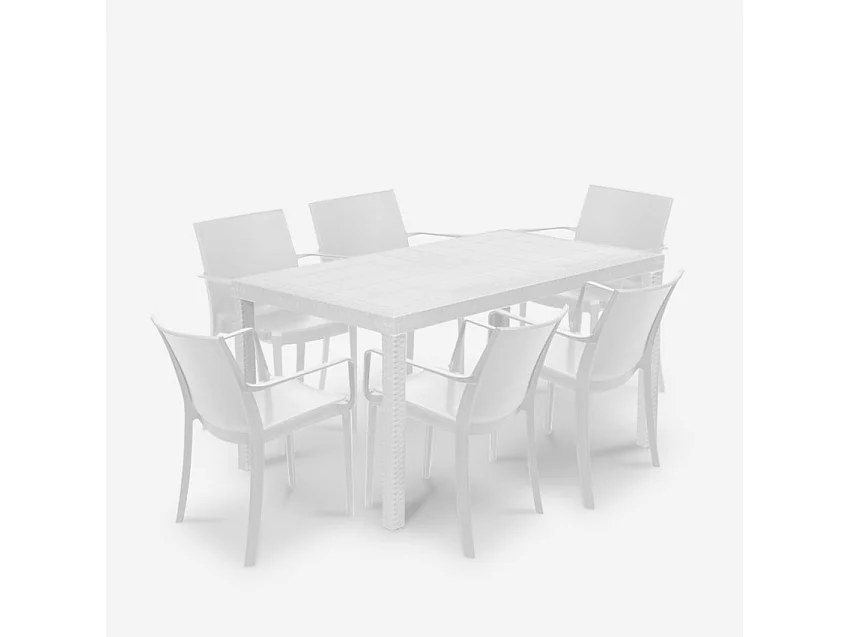 Juego de exterior de jardín compuesto por 1 mesa efecto ratán de 150x90 cm y 6 sillas color blanco Meloria Light