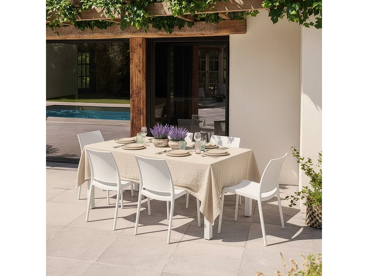 Juego de exterior de jardín compuesto por 1 mesa efecto ratán de 150x90 cm y 6 sillas color blanco Meloria Light