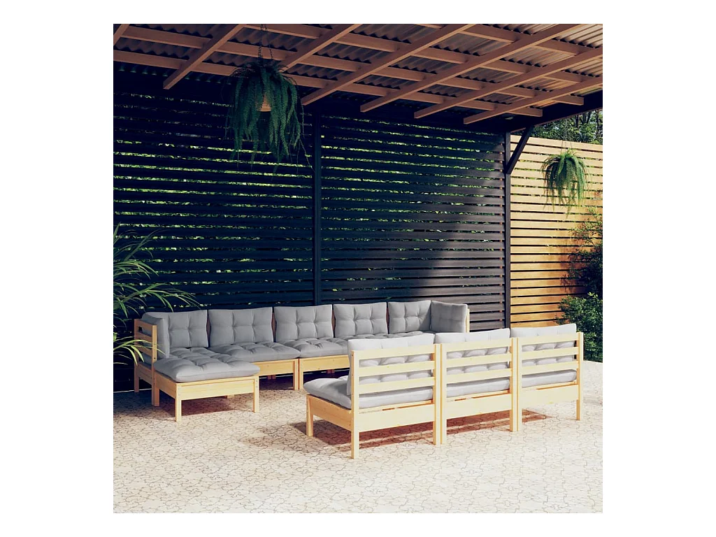 Muebles de jardín 11 pzas y cojines madera maciza de pino gris