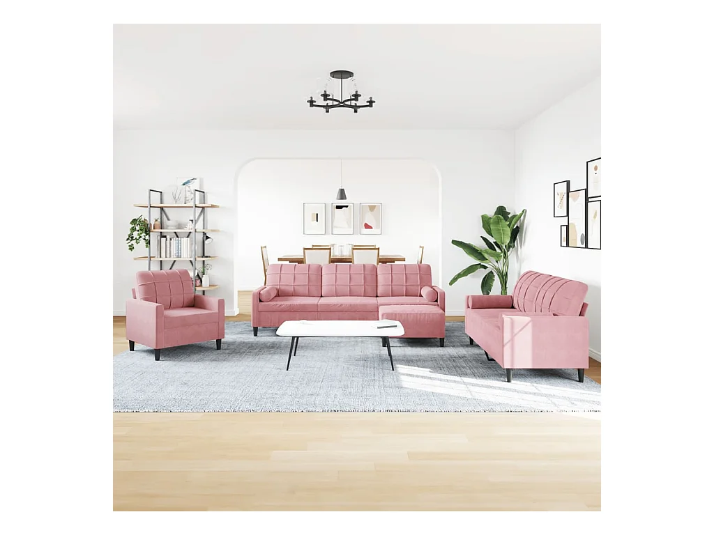 Juego de sofá de 3 piezas con cojines y almohadones de terciopelo rosa