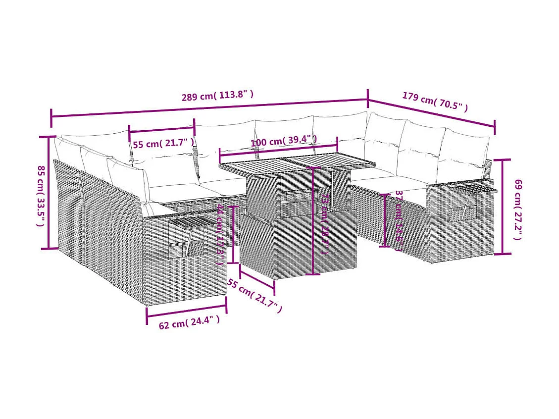 Set de sofás de jardín 9 piezas con cojines ratán sintético beige