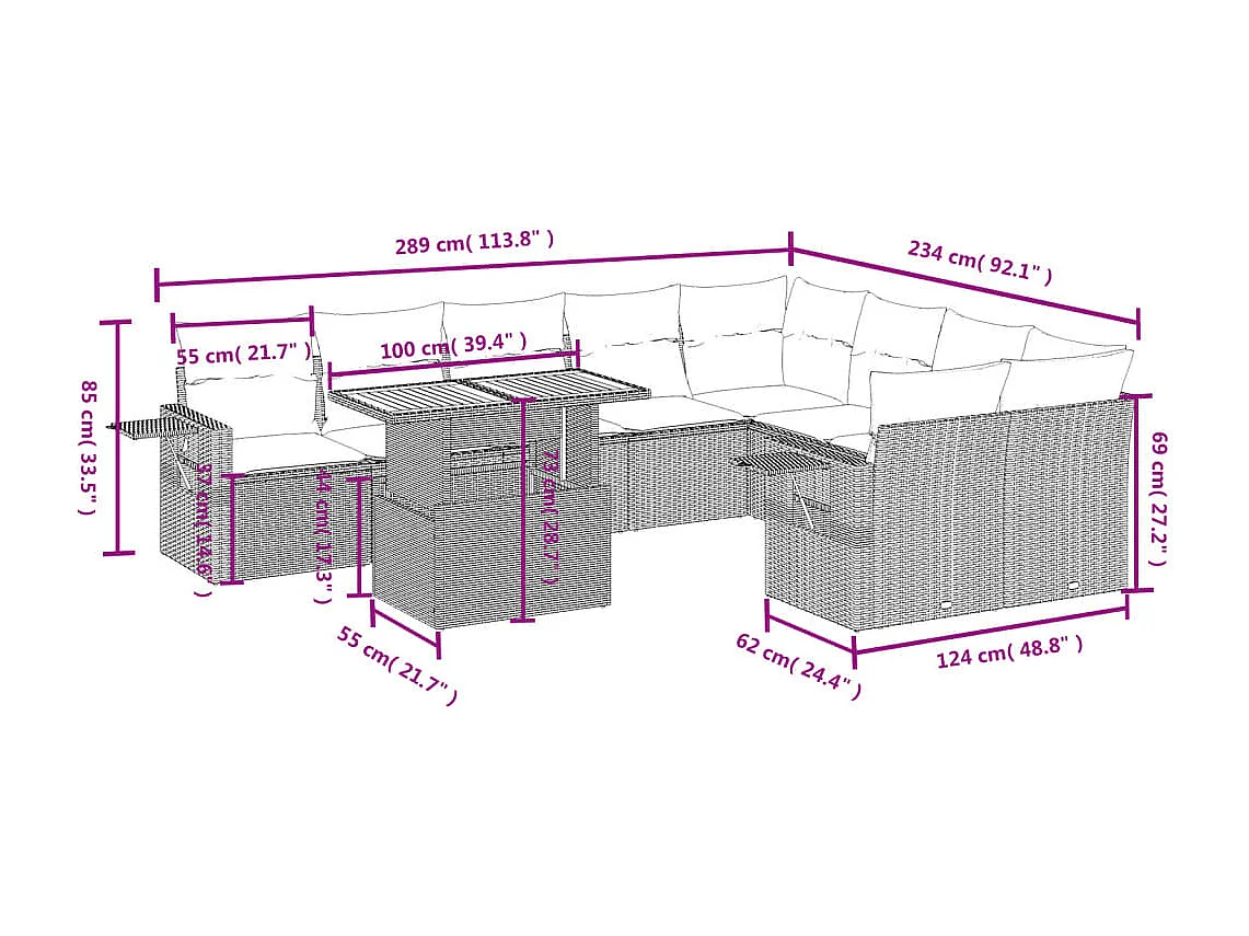 Set de sofás de jardín 9 piezas con cojines ratán sintético beige