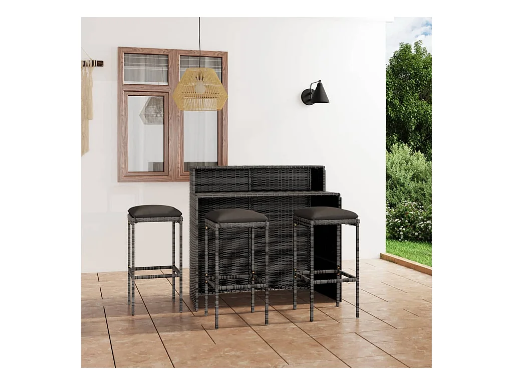 Juego muebles de bar para jardín 4 piezas y cojines gris