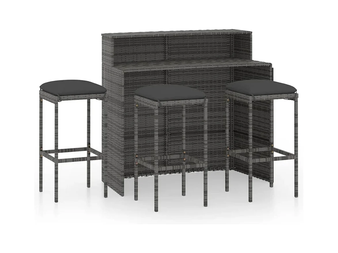 Set de muebles de bar de jardín 5 piezas y cojines ratán PE gris
