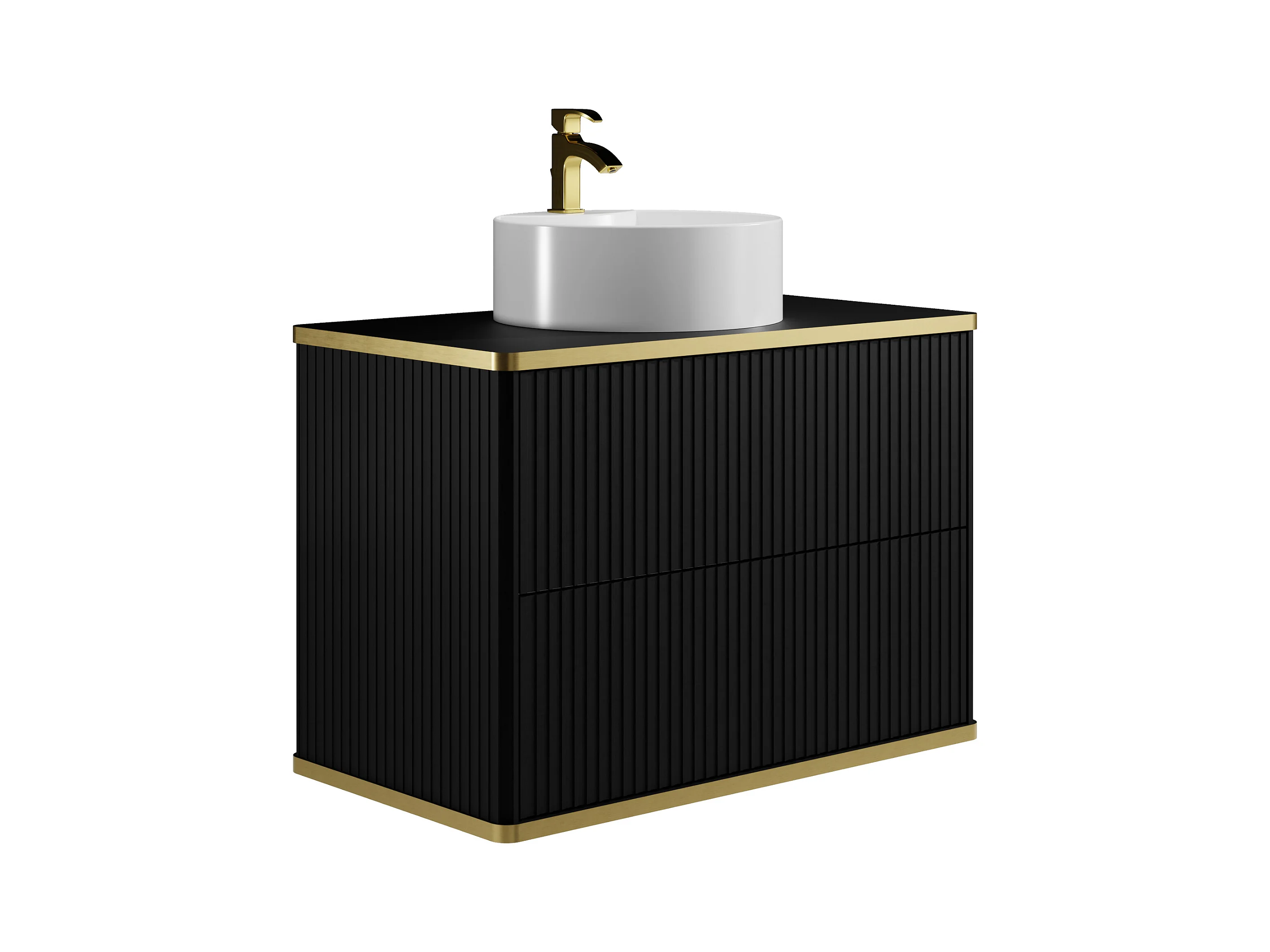 Mueble de baño suspendido estriado con ribete dorado y lavabo redondo - Negro - 80 cm - KELIZA