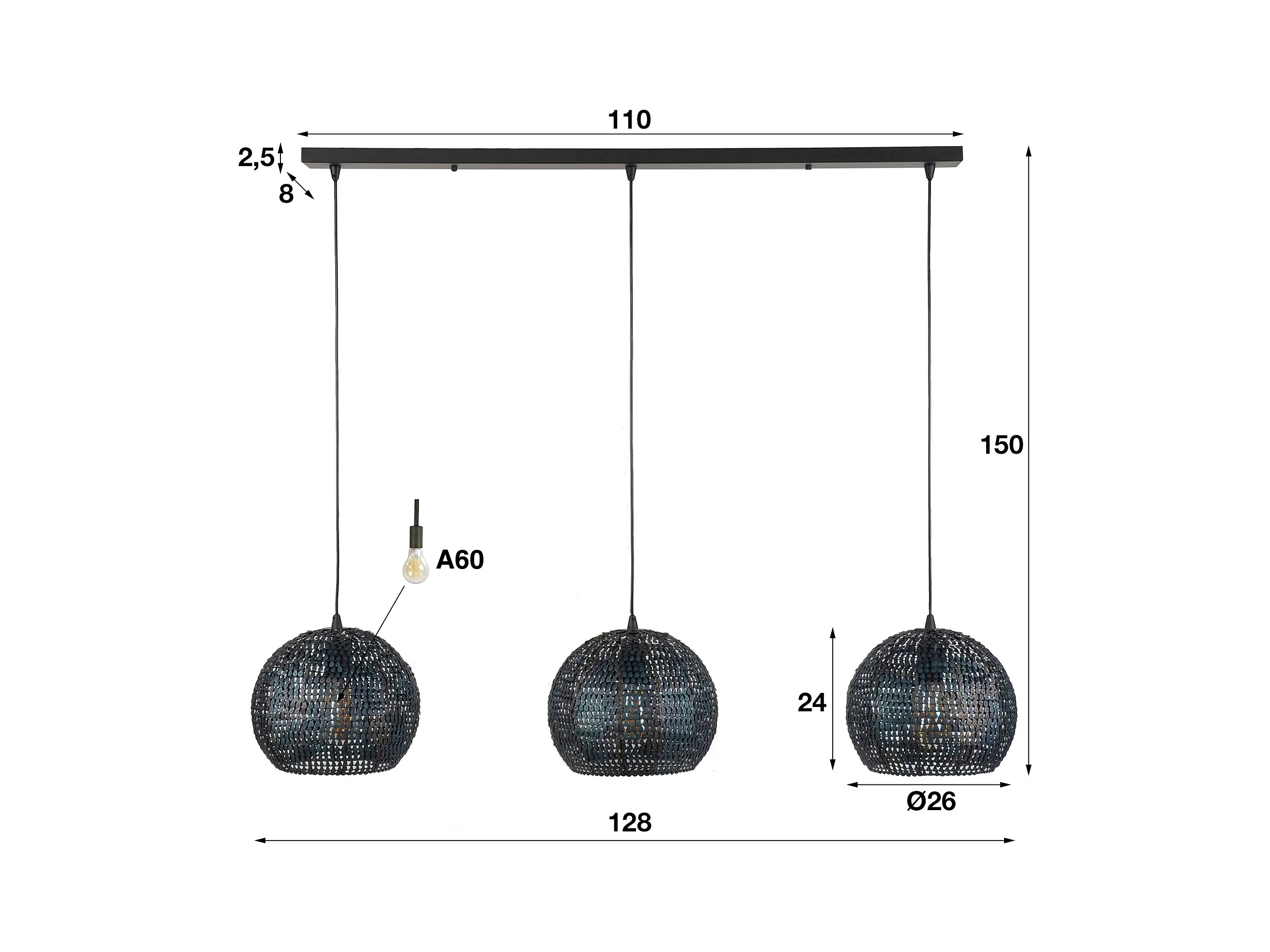 Lámpara colgante - 3 lámparas colgantes ovaladas de metal de Ø26 - Armadura - Acabado quemado