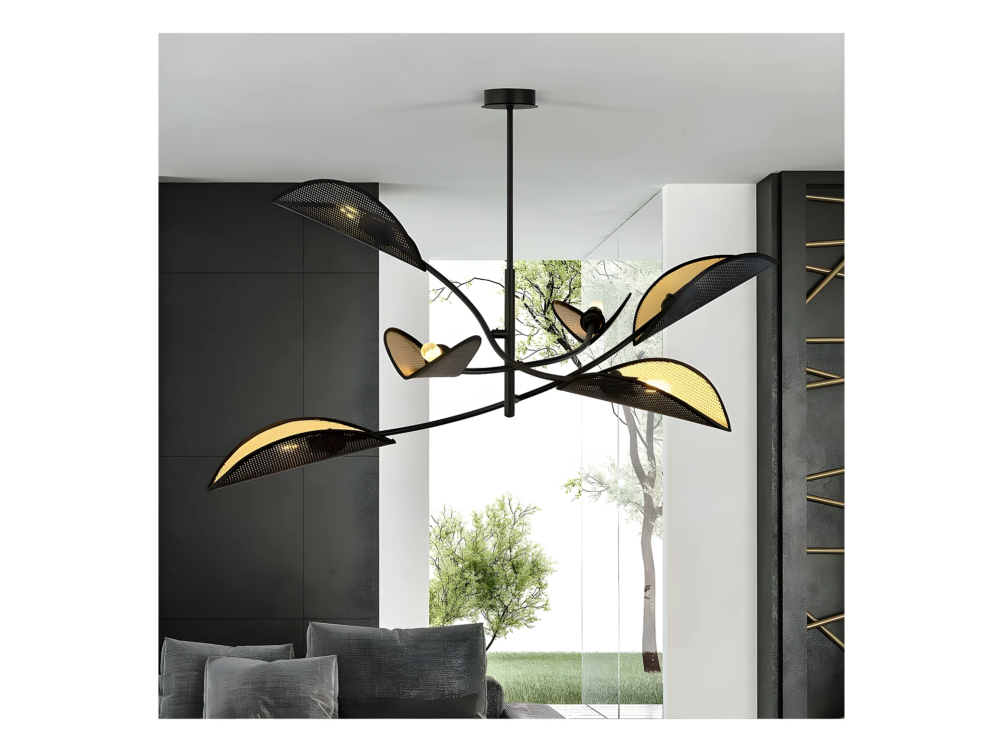 Lámpara de araña Flik con 6 pantallas de tela en forma de hoja negro y dorado 6xE14 ø102cm