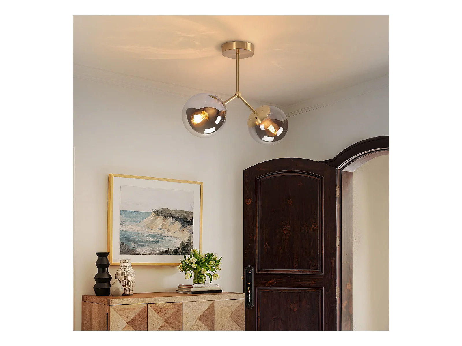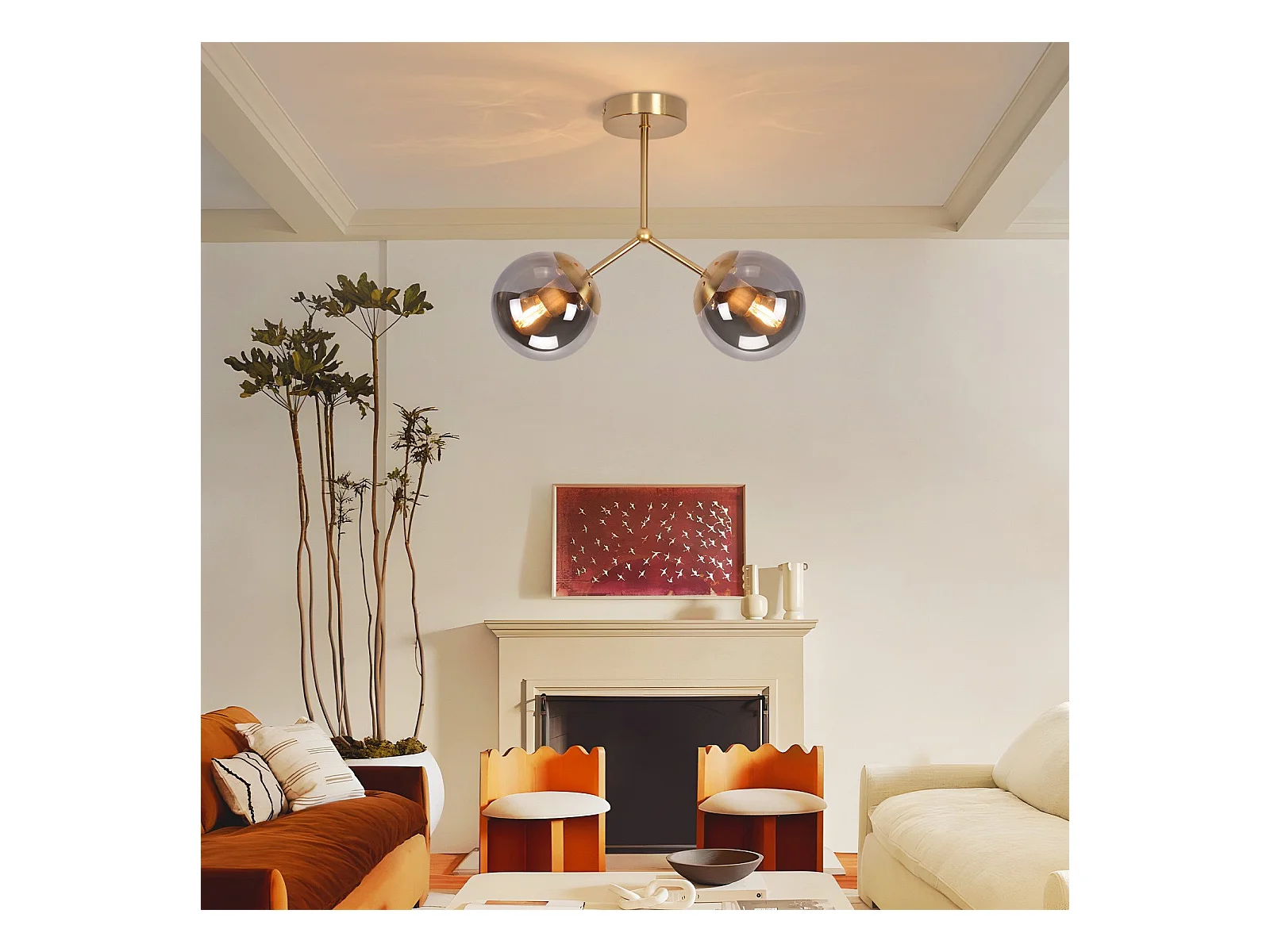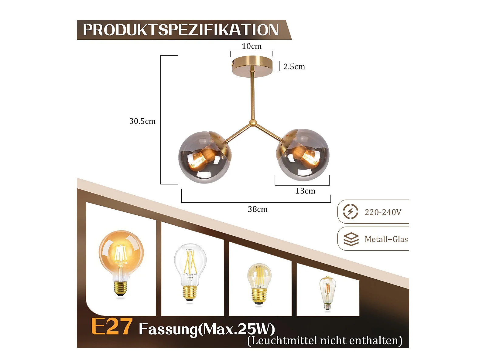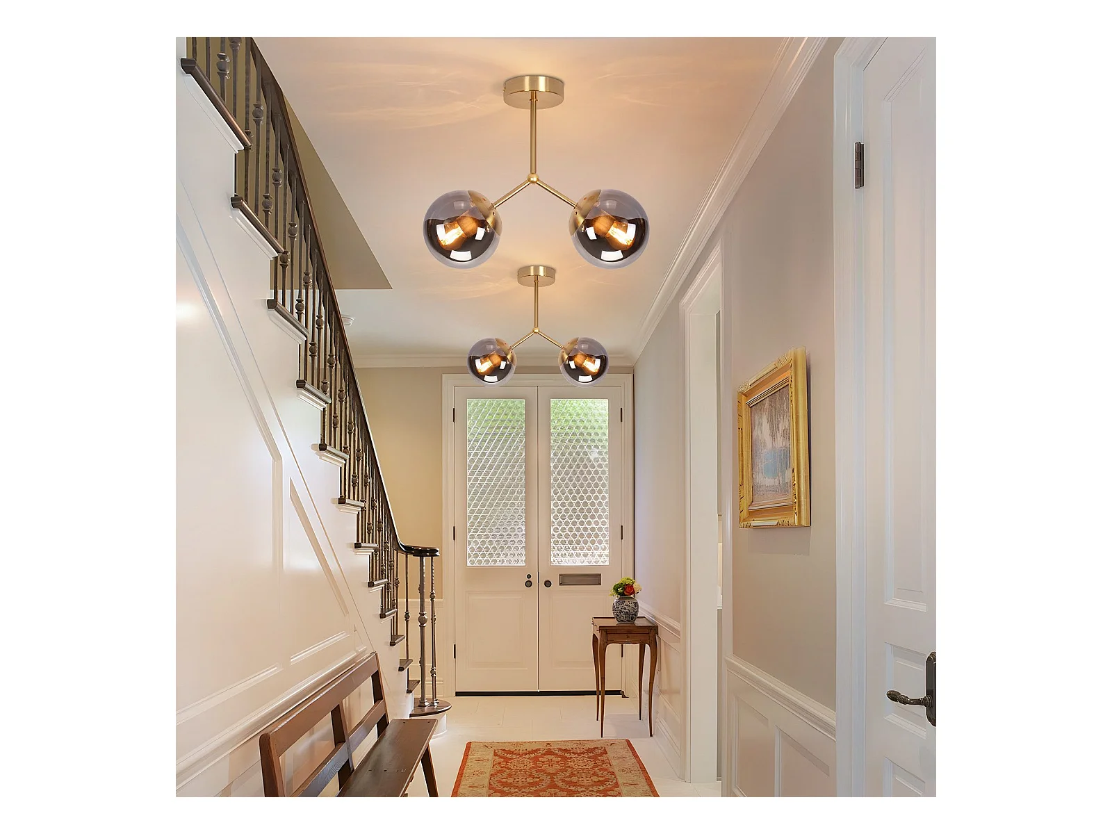 Lámpara de techo para pasillo NETTLIFE: Lámpara de techo vintage E27 con bola de cristal dorado y 2 luces.