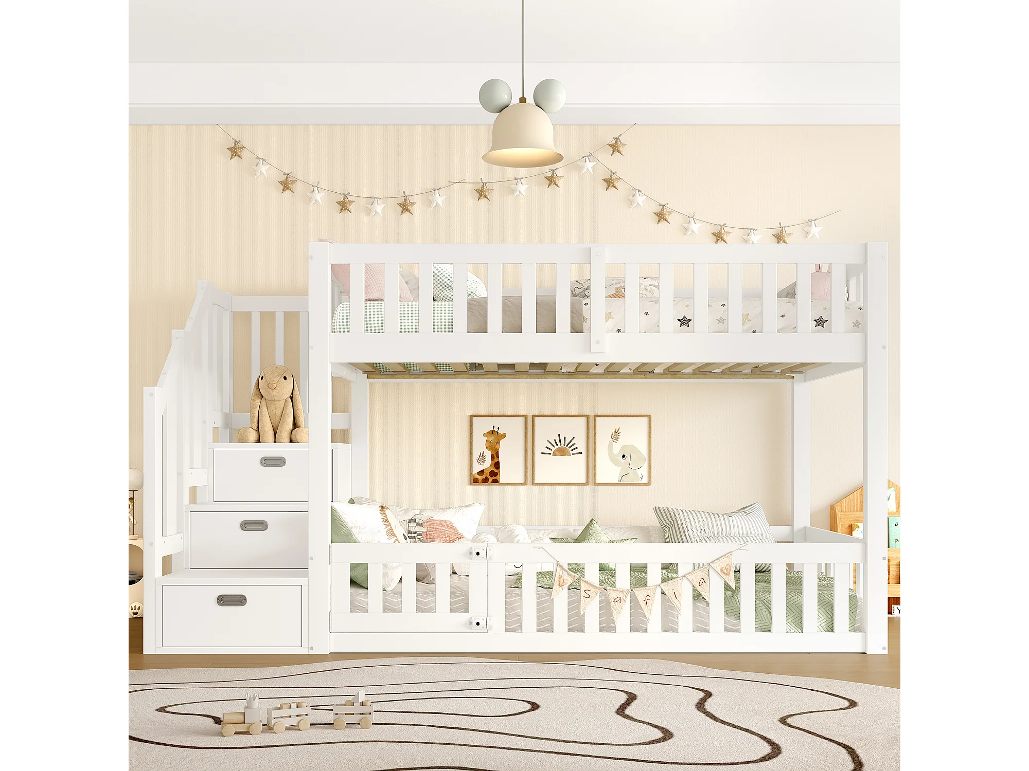 Litera infantil de 90x200 cm con 3 cajones, 2 puertas y luz nocturna LED - Blanca