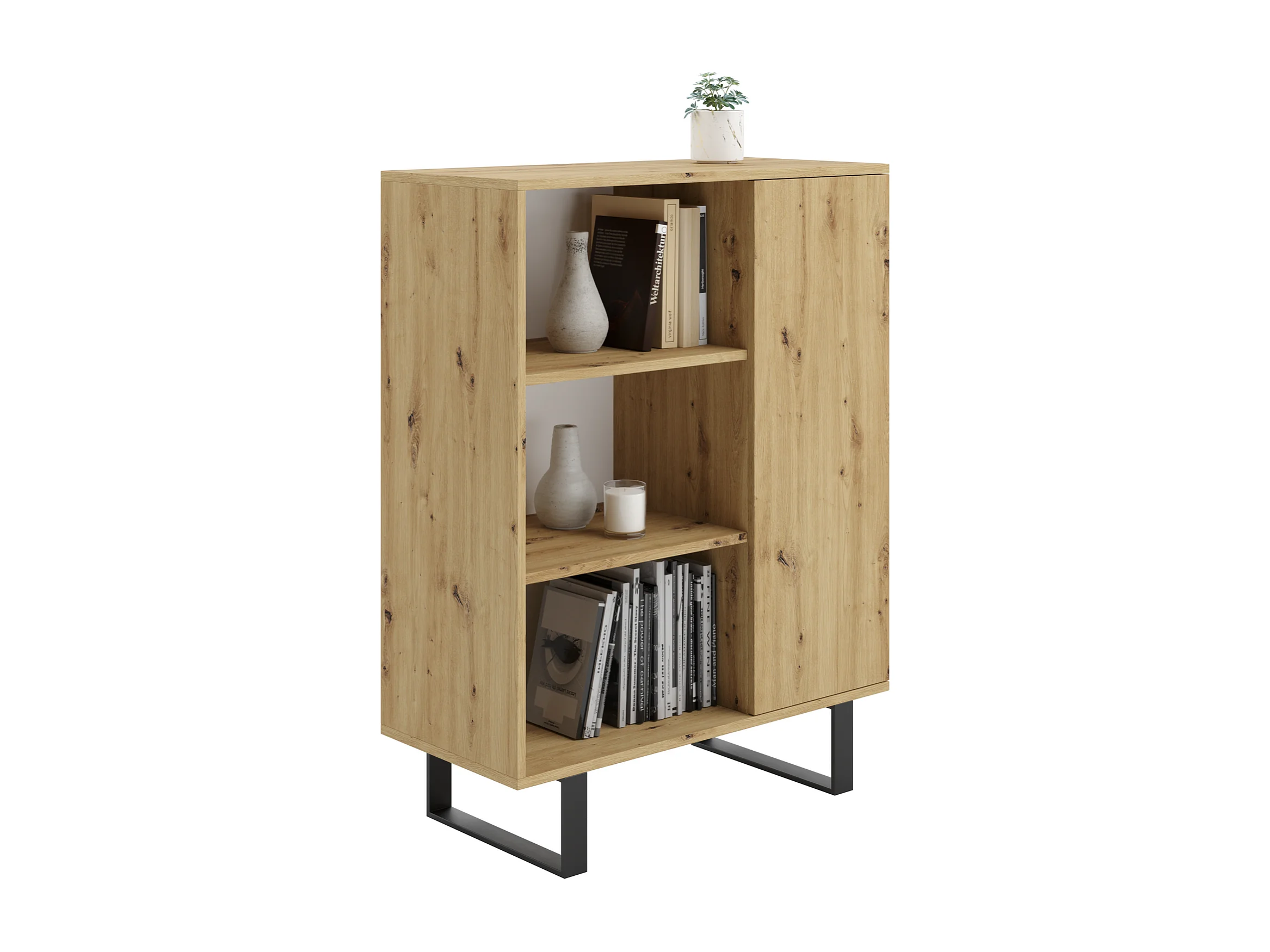 Librería Color Roble artesanal 90x116x40 cm – Estilo Escandinavo con 3 Estantes, 1 Puerta y Patas Metálicas
