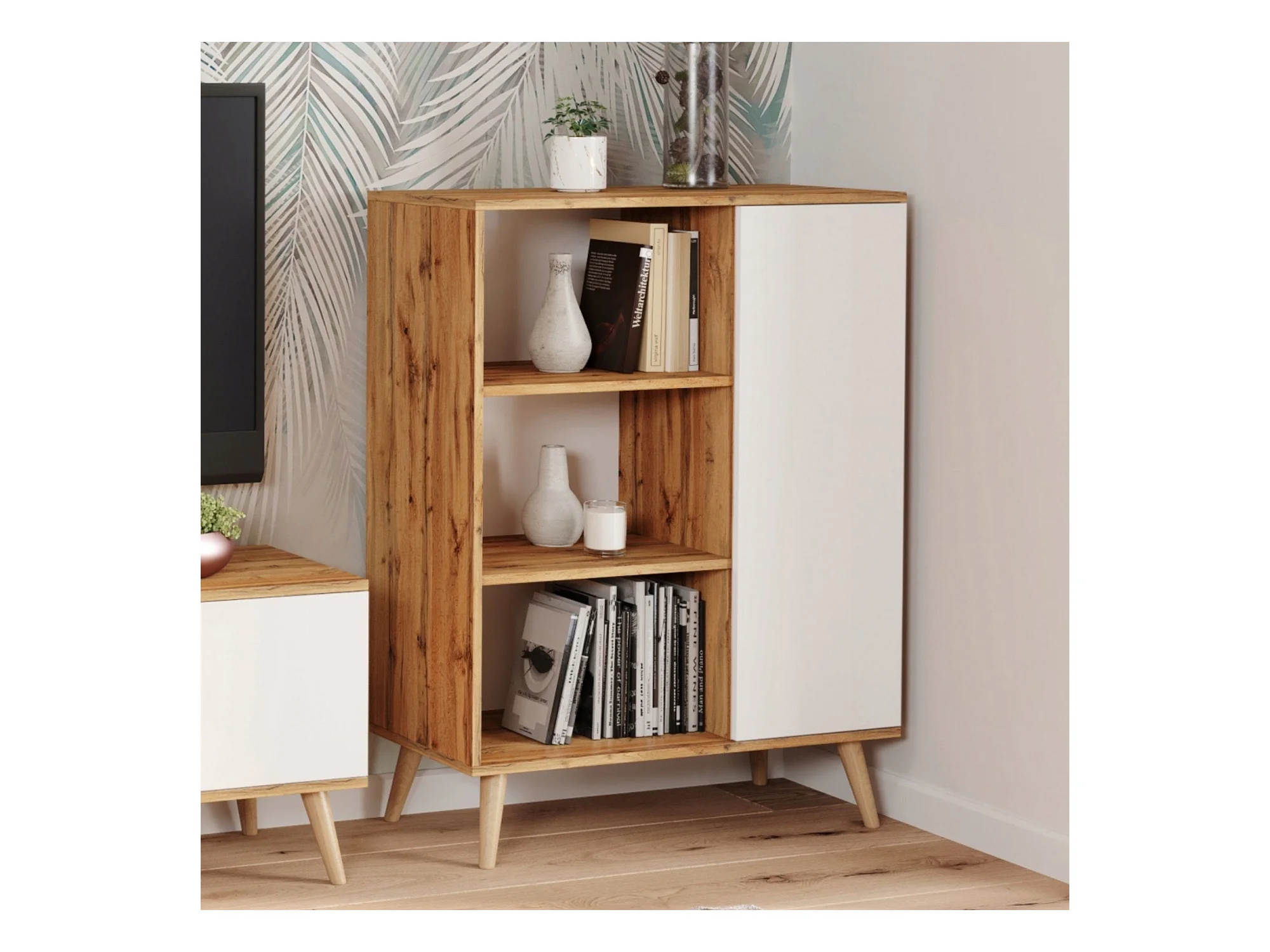 Librería Color Roble y Blanco 90x116x40 cm – Estilo Escandinavo con 3 Estantes, 1 Puerta y Patas de Madera
