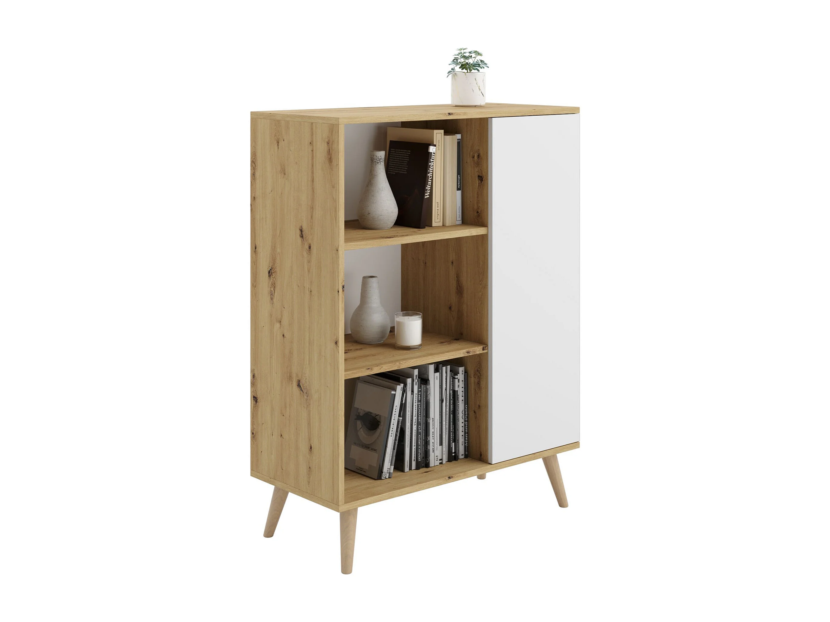 Librería Color Roble Artesanal y Blanco 90x116x40 cm – Estilo Escandinavo con 3 Estantes, 1 Puerta y Patas de Madera