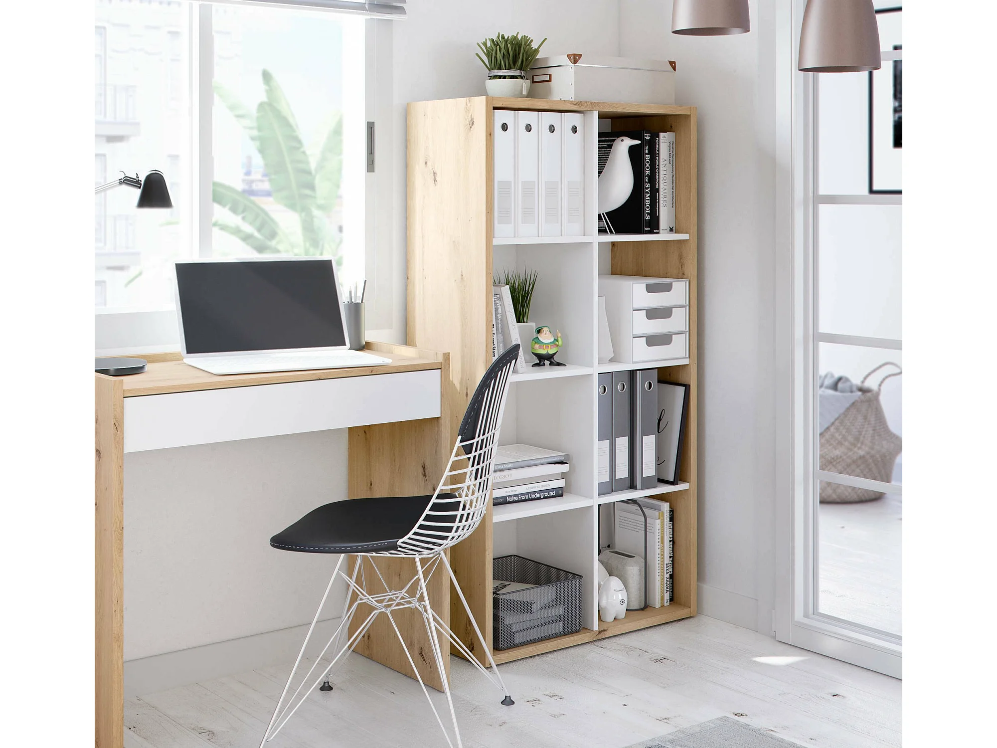 Librería Dmarini, Librería reversible con 8 compartimentos, Soporte TV multiposición, 72x33h137 cm, Roble efecto nudo y Blanco