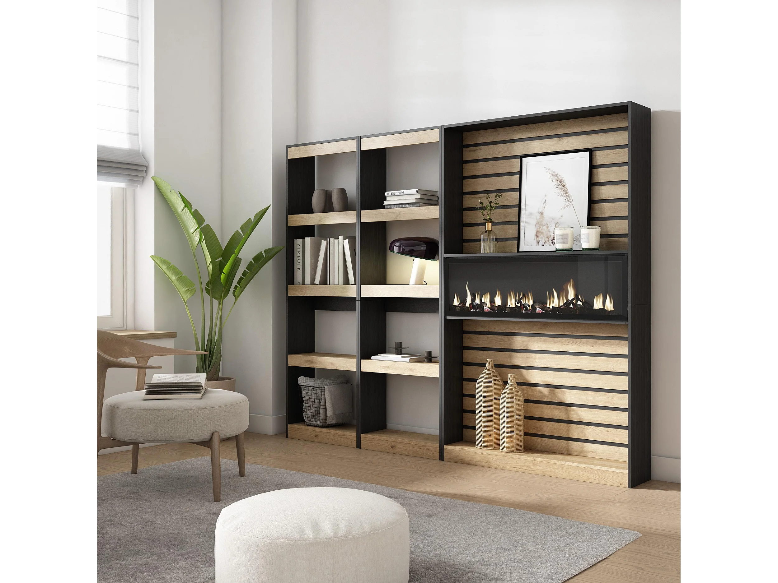 Librería estantería, 230x25x186cm, Salón - Comedor - Oficina, Chimenea eléctrica, Roble y negro