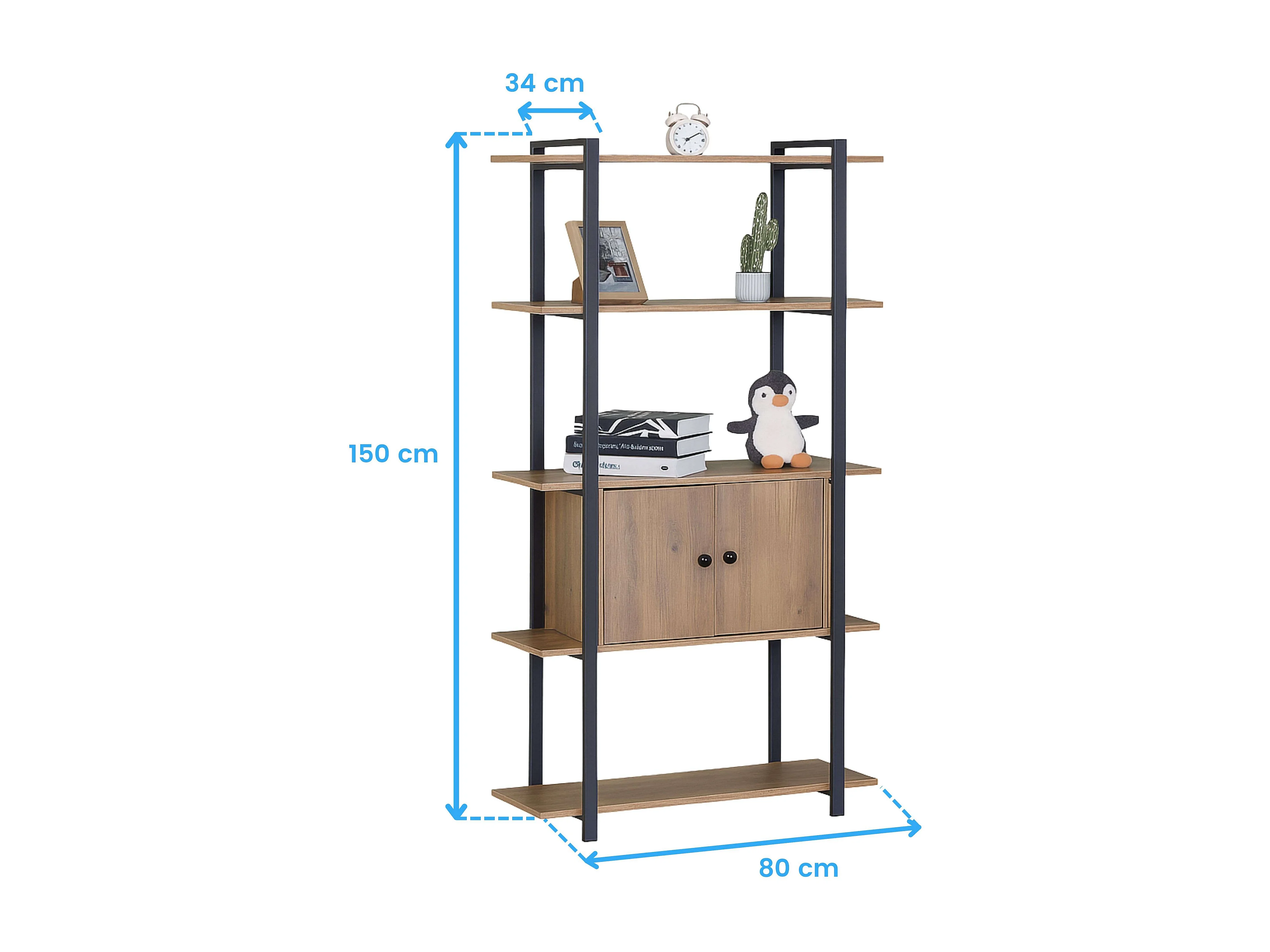 Librería salón 4 estantes 2 puertas roble y negro 80x150x34 cm.
