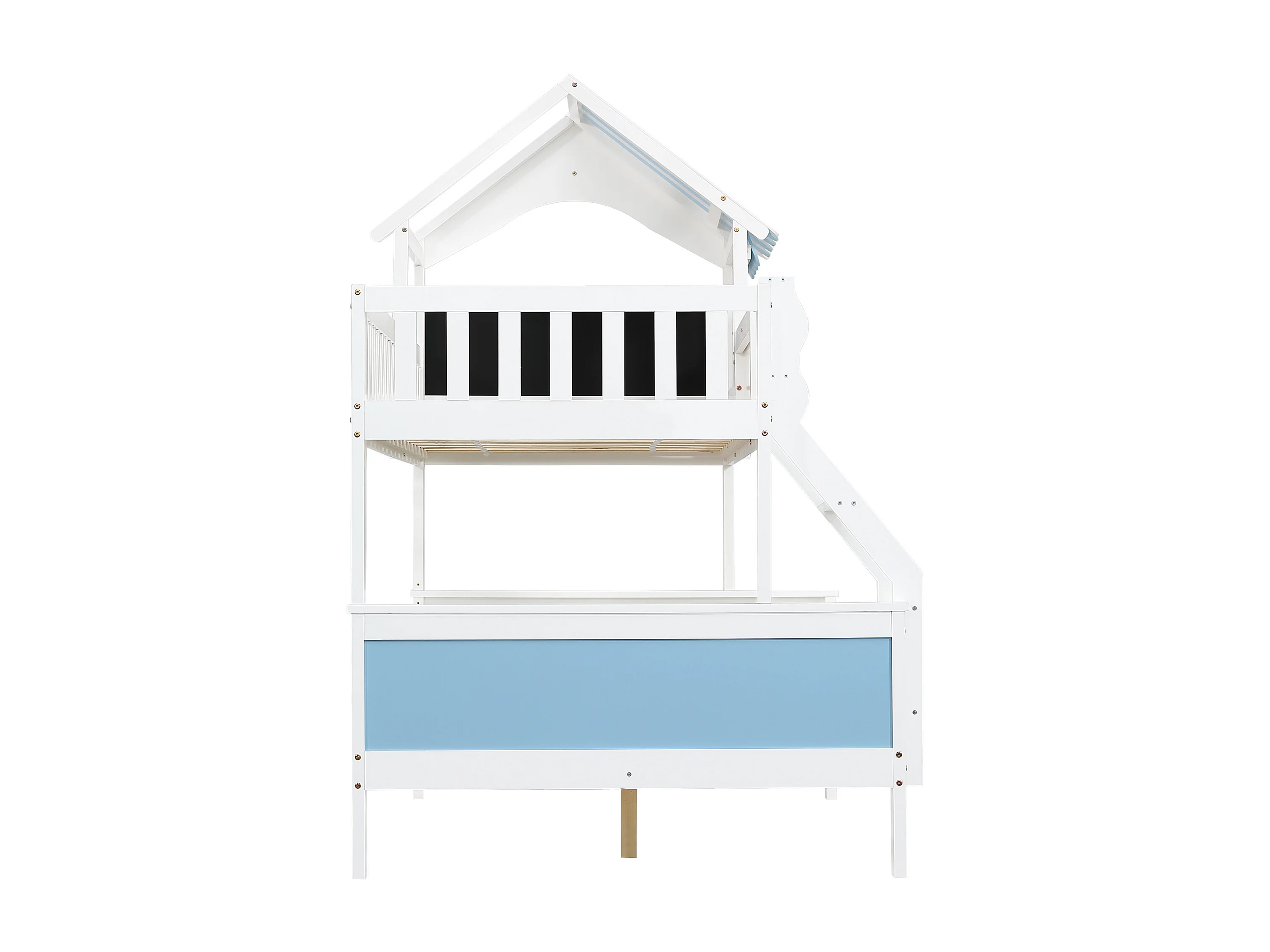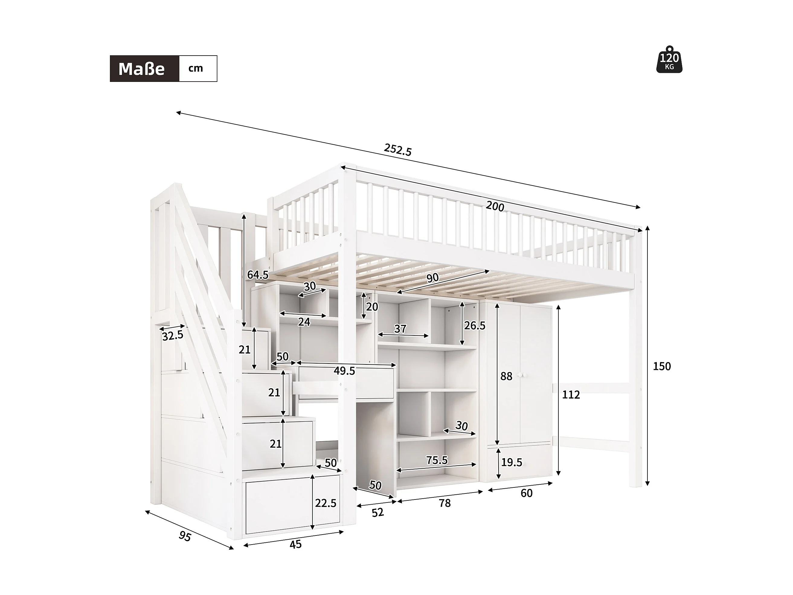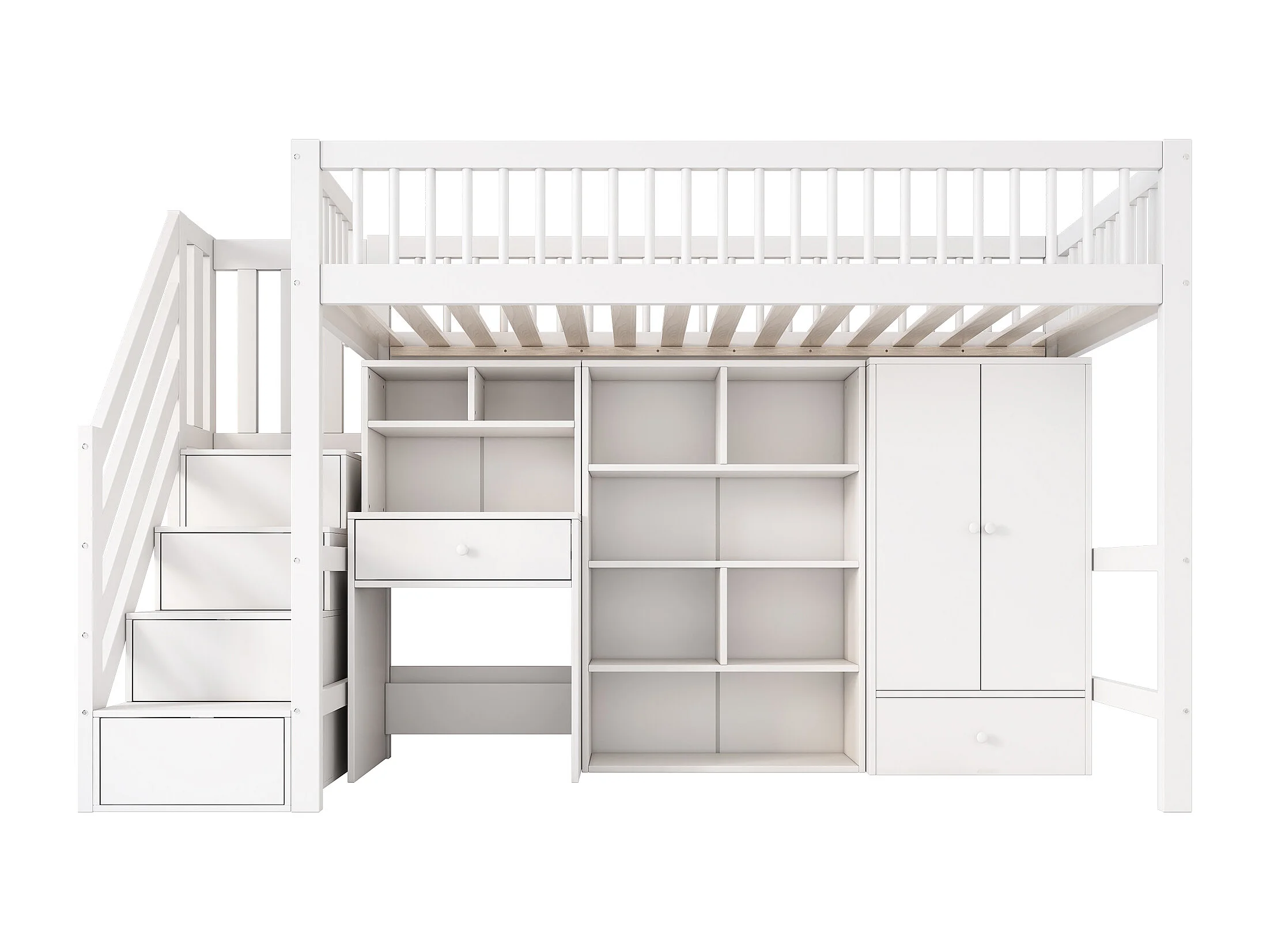 Cama infantil 90x200 cm con escritorio, con escalera de almacenaje y espacios de almacenamiento, madera y MDF blanco (Sin colchón)