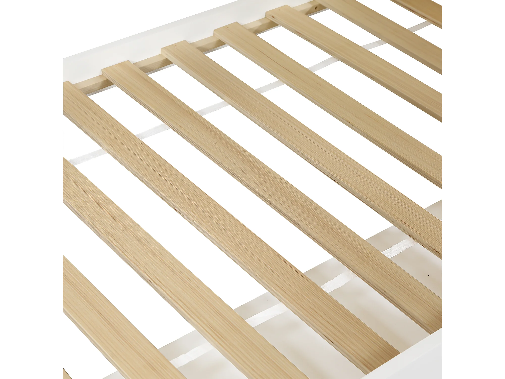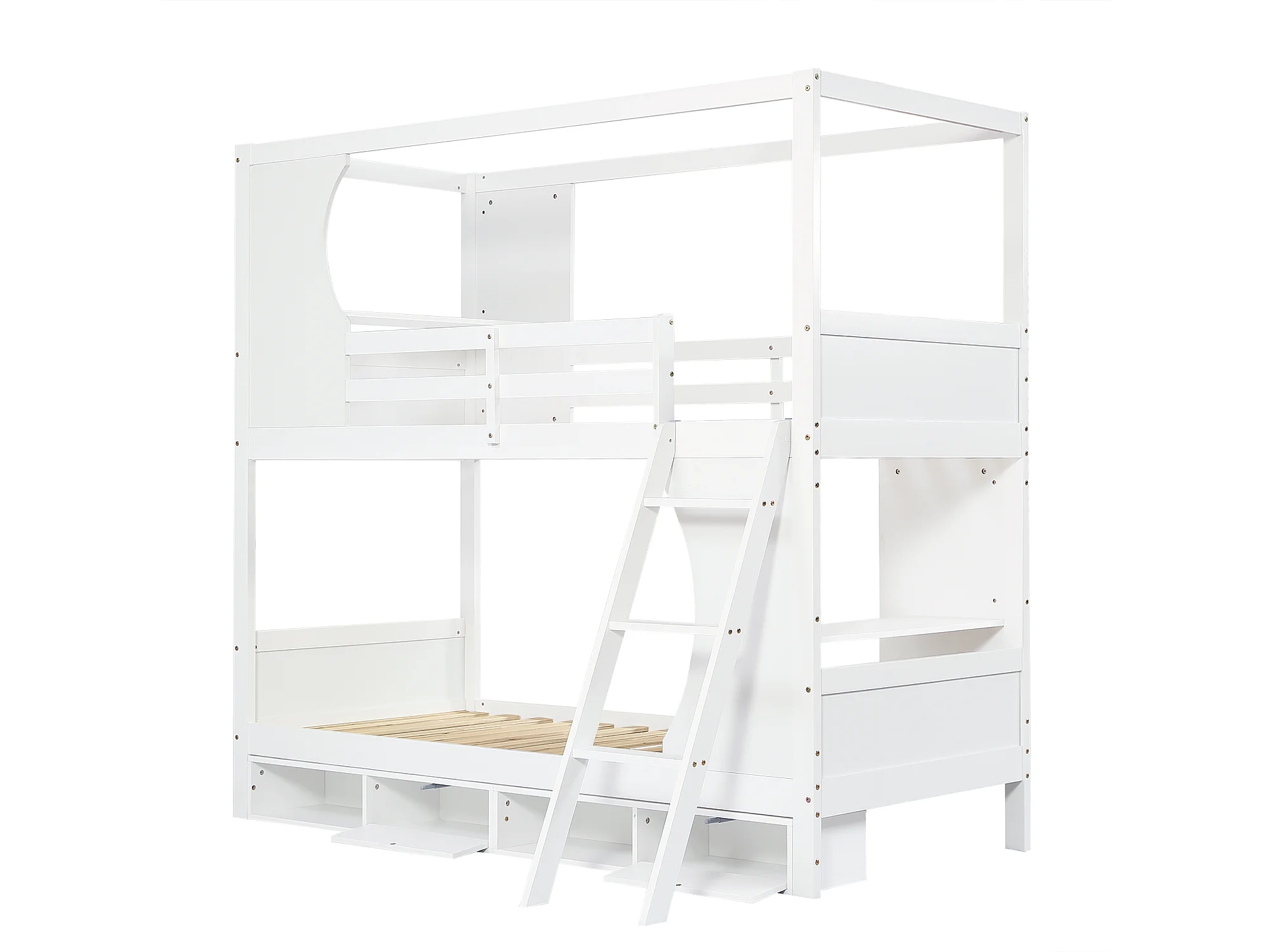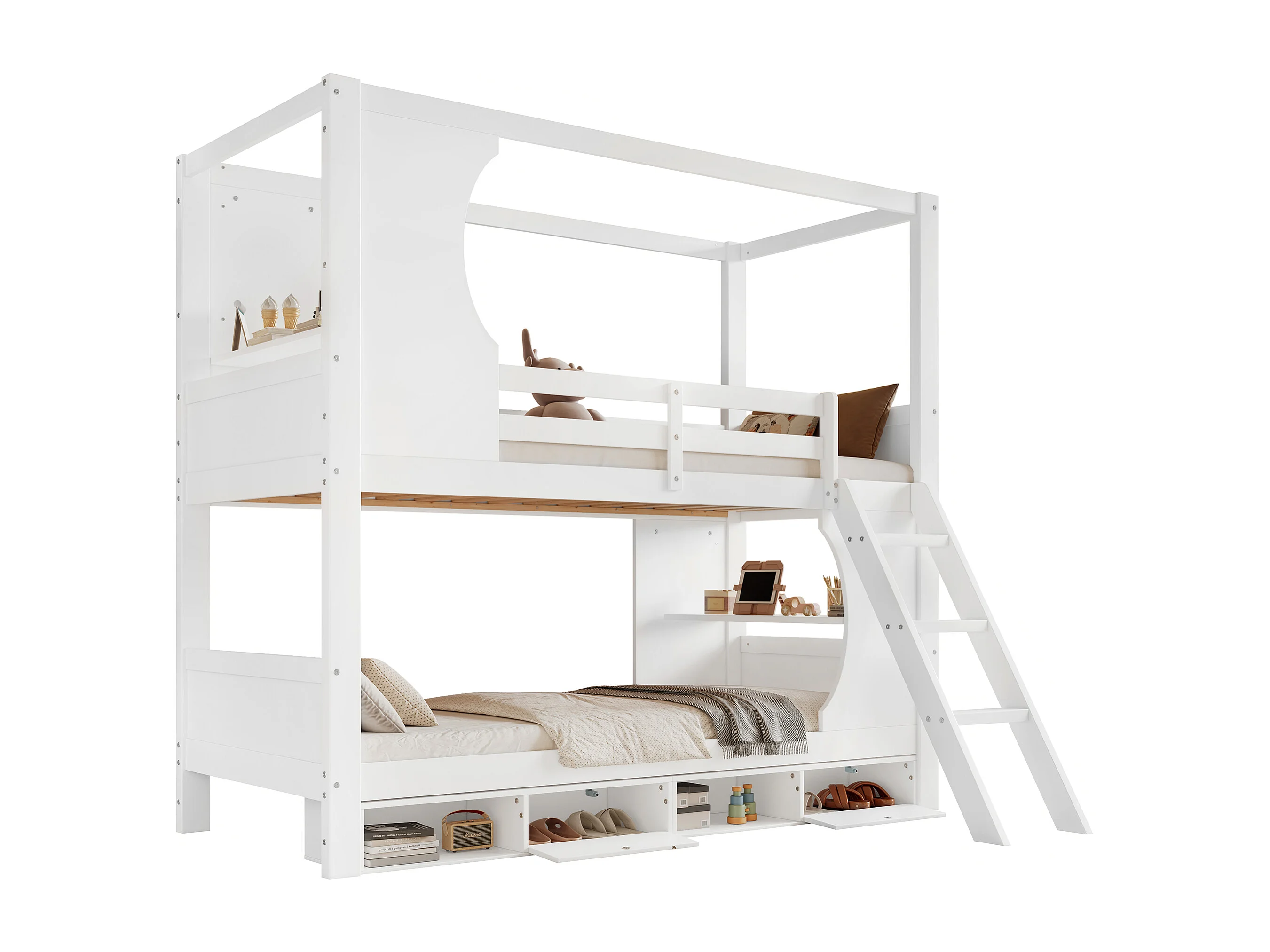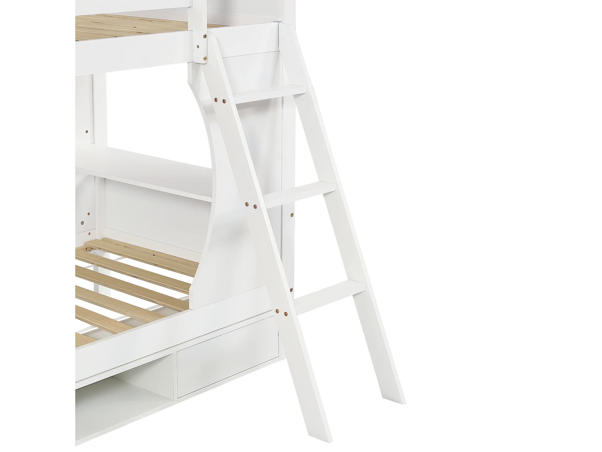 Litera infantil 90x200 cm con mesas integradas, con barandillas de seguridad, con zapatero de 4 compartimentos, MDF, Blanco (Sin colchón)