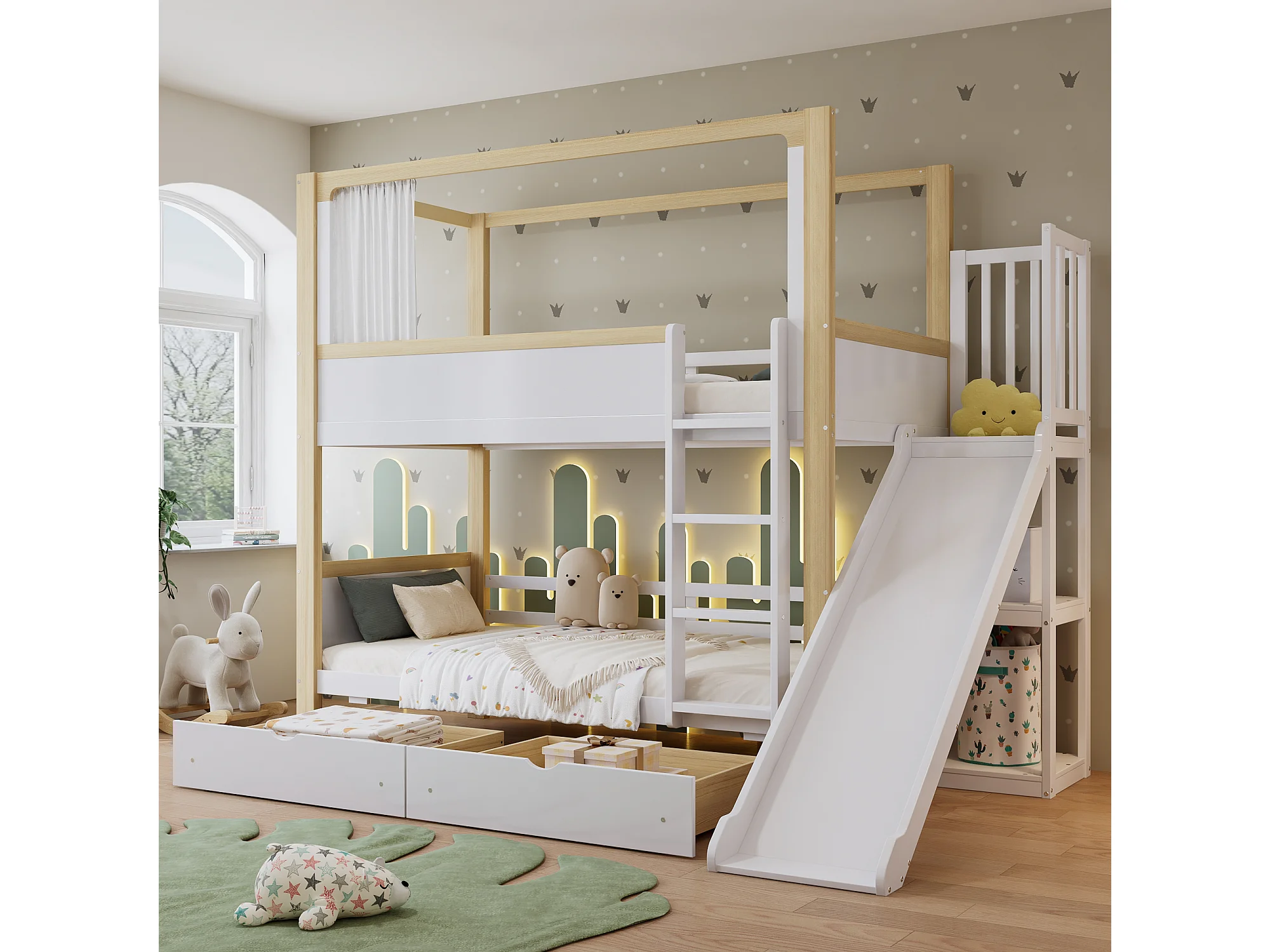 Litera 160x200cm cama infantil moderna con almacenamiento y escalera madera y MDF para habitación Blanco y natural (Sin colchón)