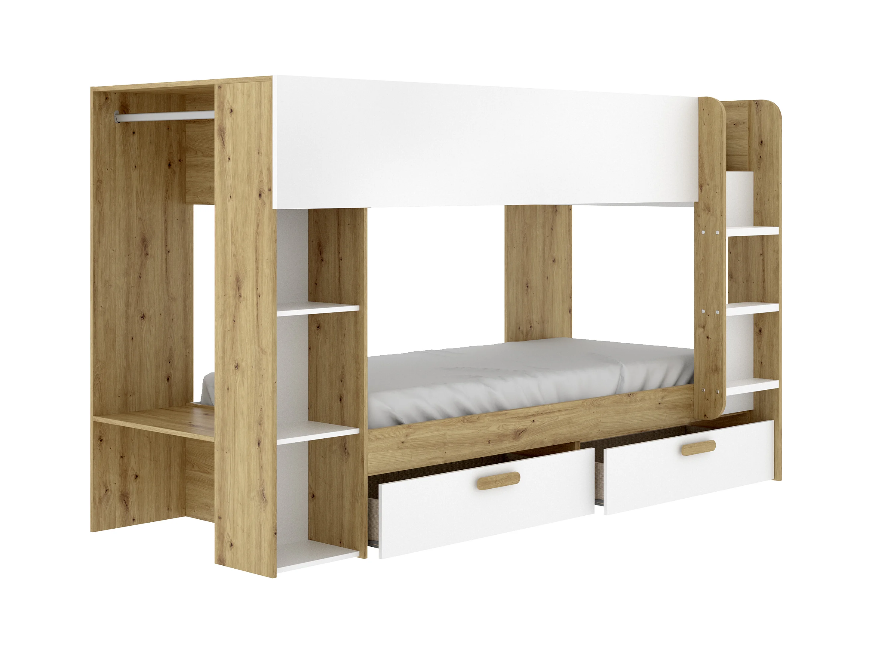 Litera 2 x 90 x 200 cm con compartimentos y ropero - Blanco y natural - OZANA