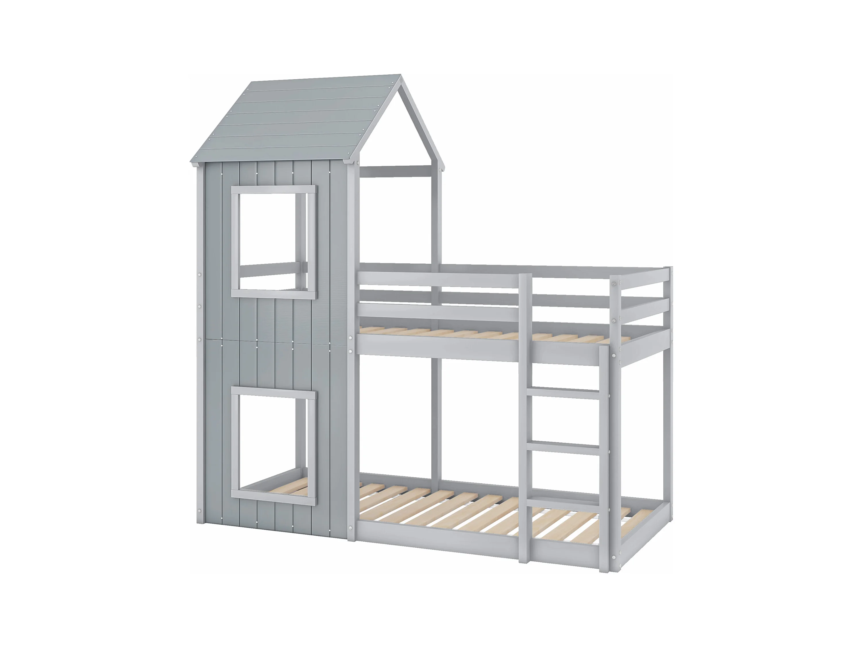 Litera 90x200 cm, casita infantil, con escalera y dosel, madera maciza, gris (204x98,5x110 cm)