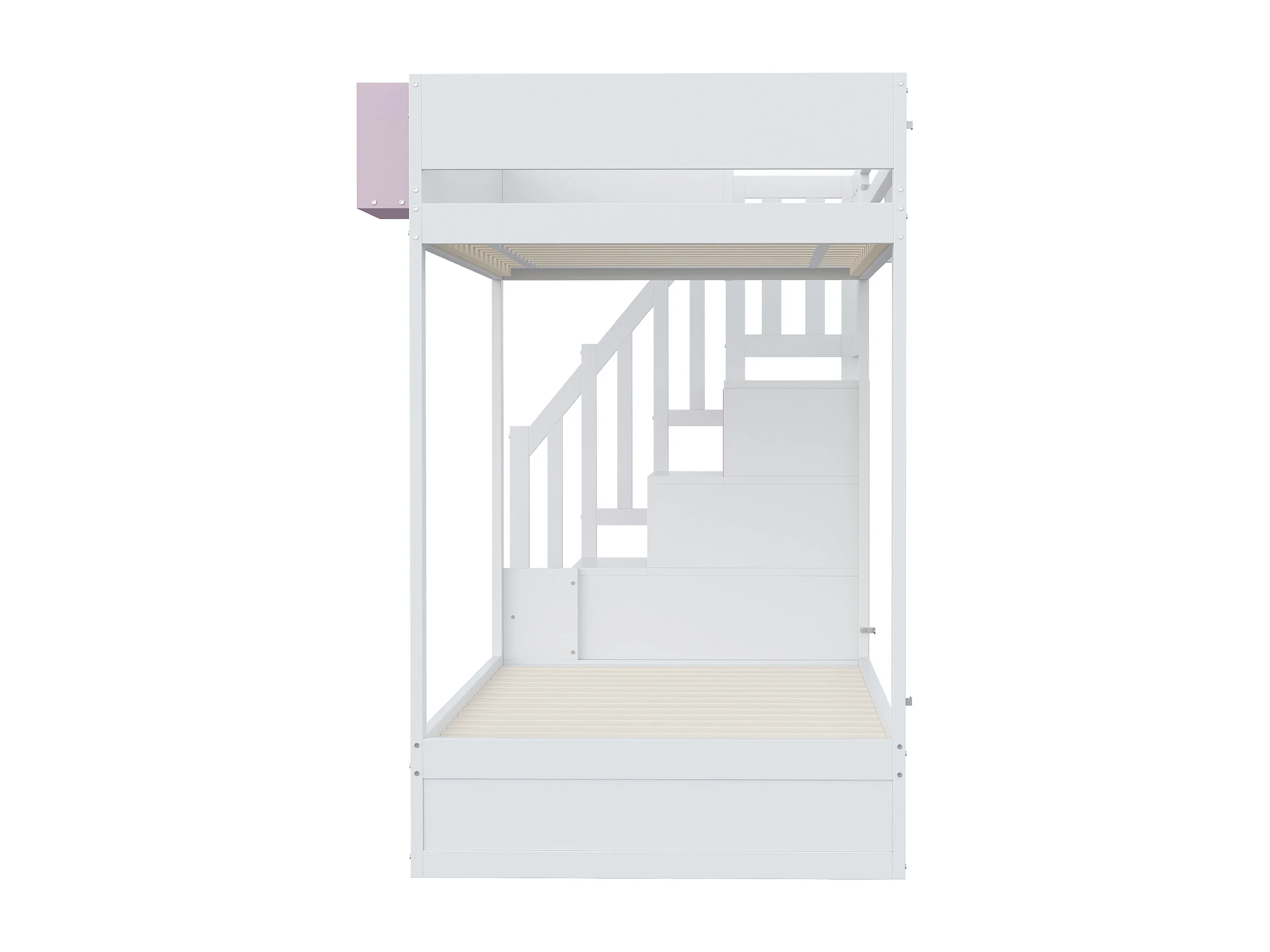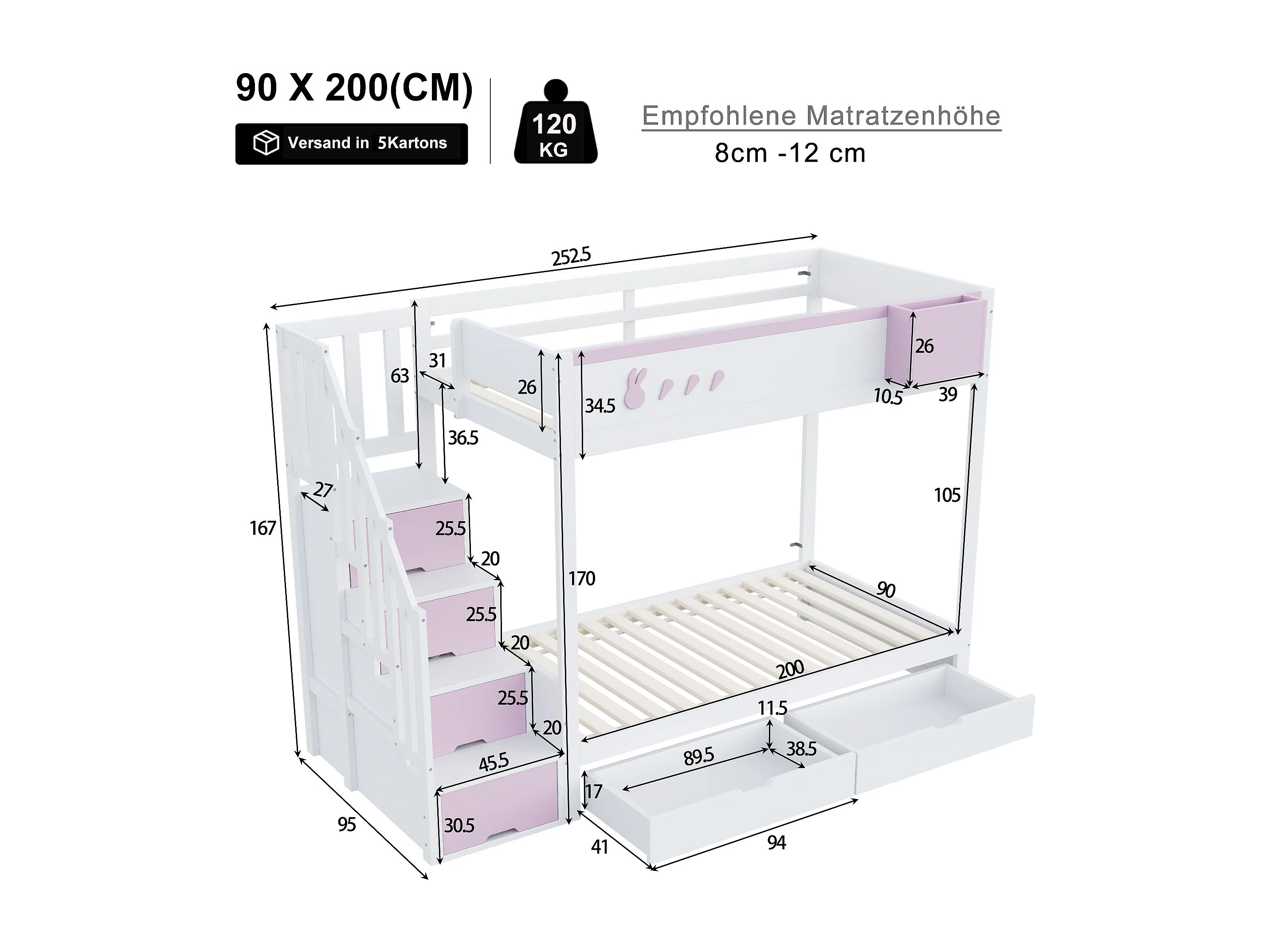 Litera 90x200cm cama infantil moderna con gran almacenaje madera habitación infantil blanco y rosa (Sin colchón)