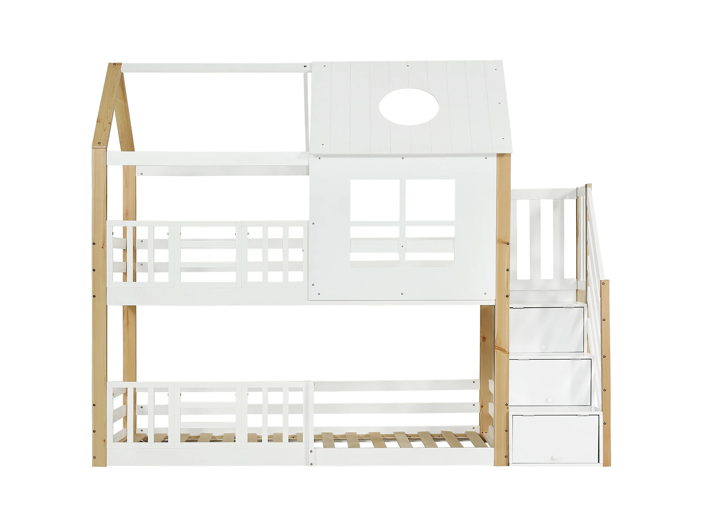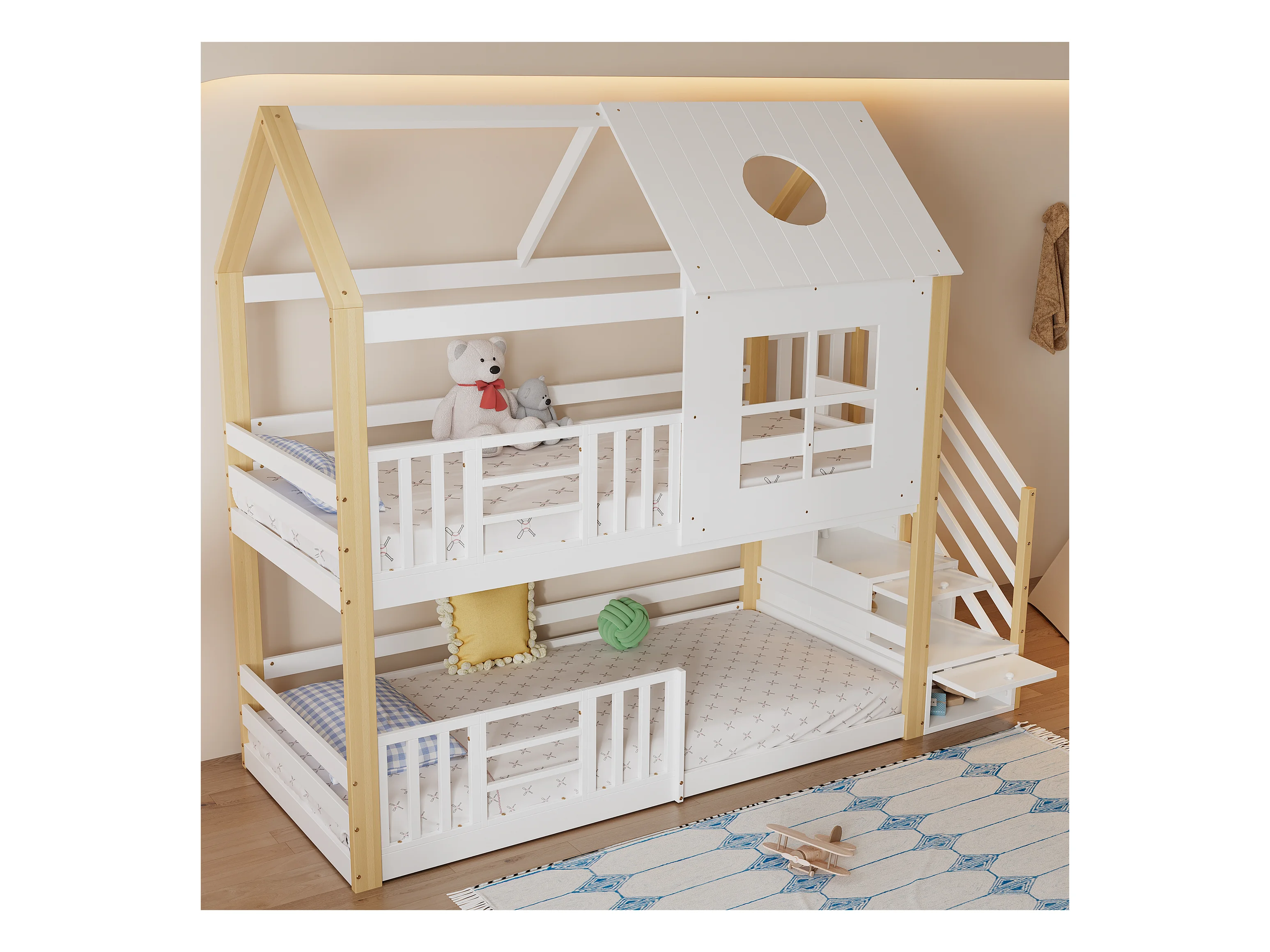 Litera cabina 90x200 cm en pino y MDF blanco/natural - Escalera con almacenaje, barreras, ventanas y techo