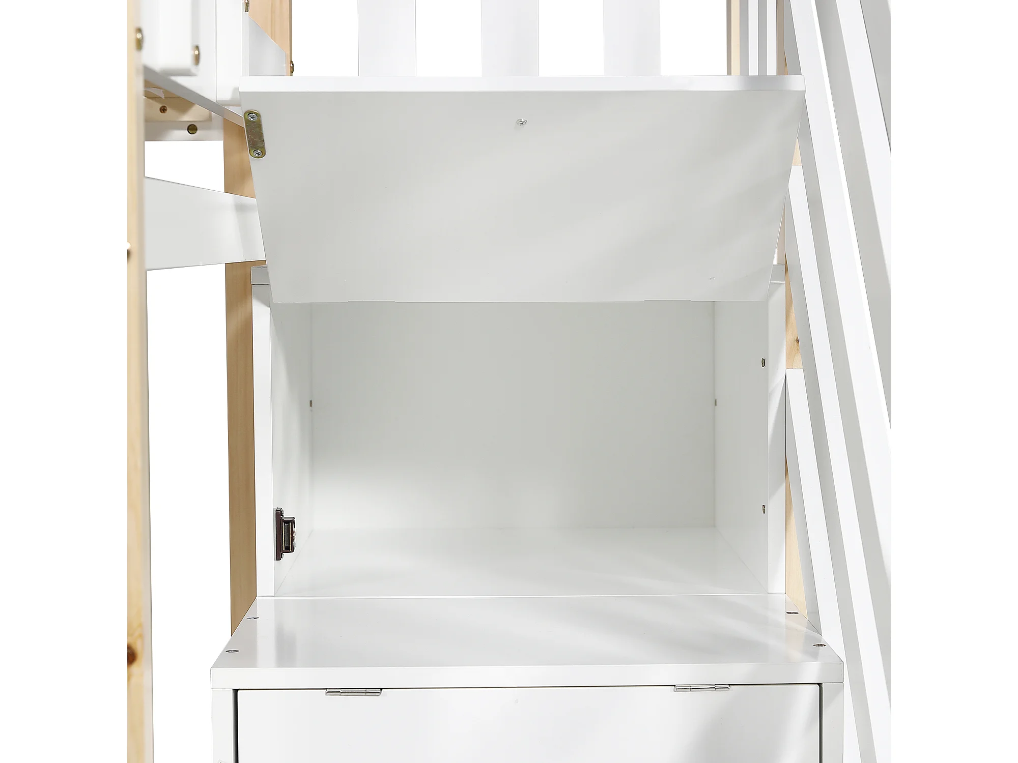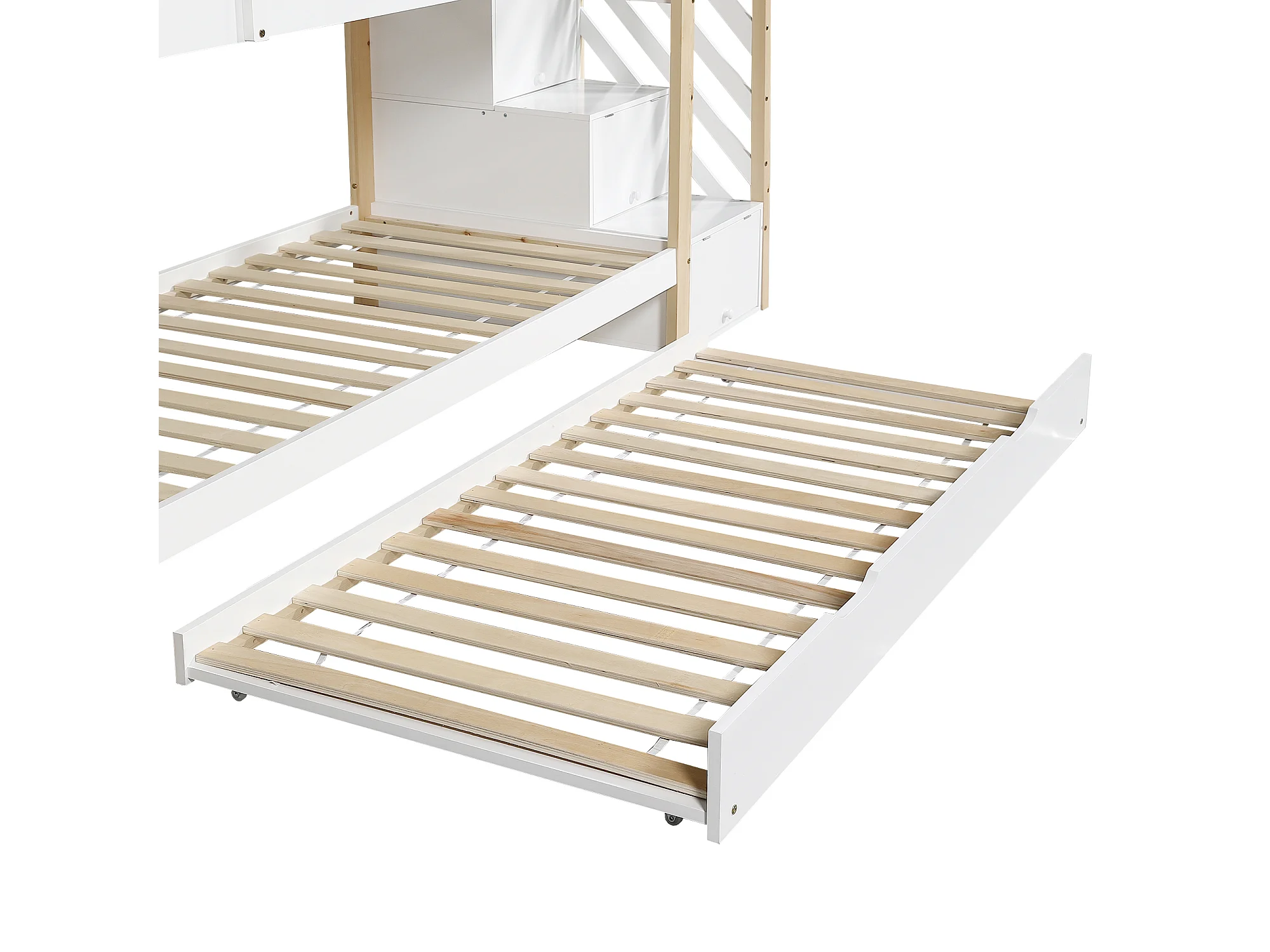 Litera casita con cama nido deslizante barreras de seguridad escalera con cajones robusta madera maciza y MDF 90x190cm blanco natural (Sin colchón)