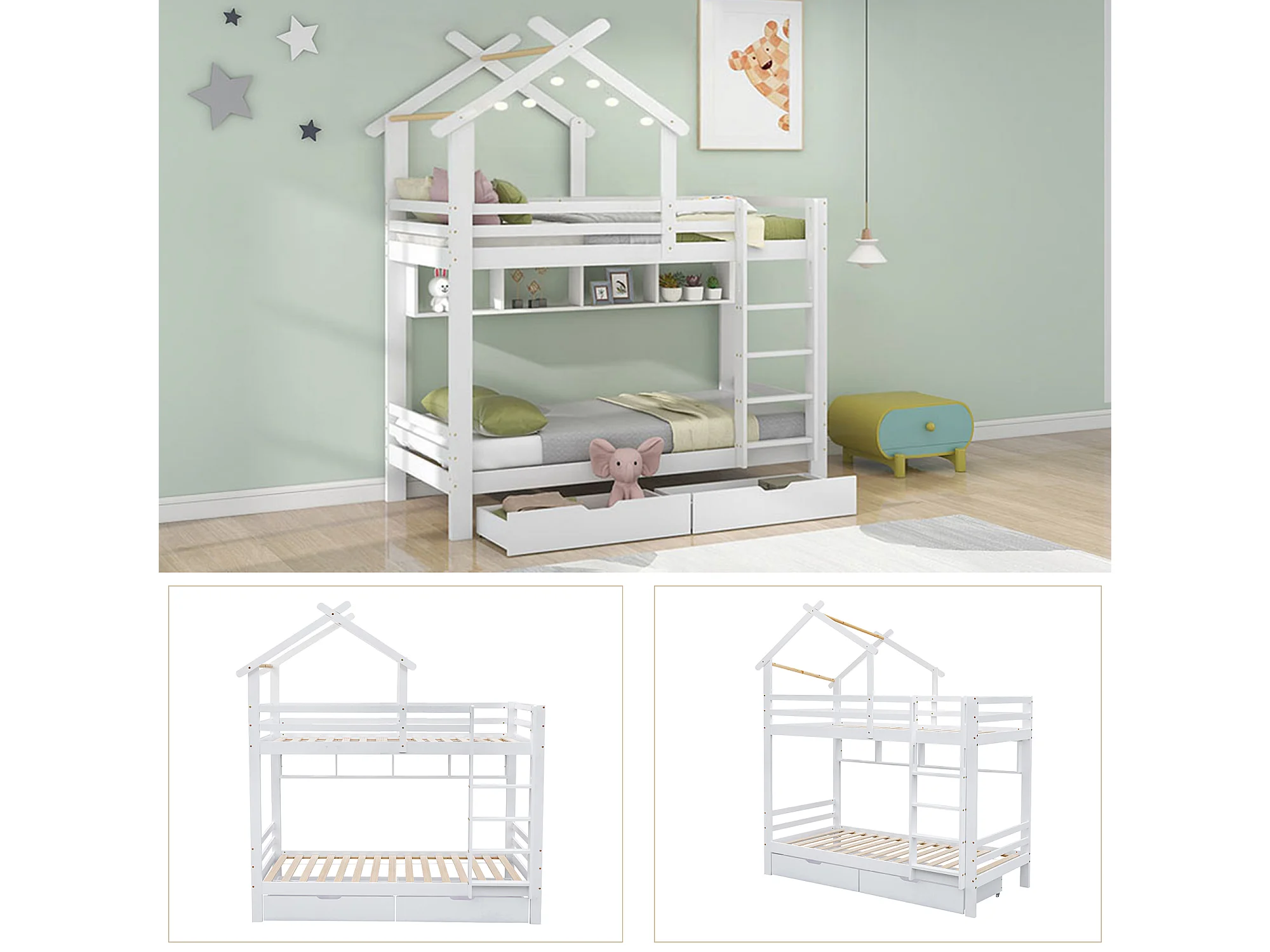 Litera con cajones y estantes, cama-casa con escalera de esquina de 3 peldaños, protección anticaídas, estructura de pino, color blanco (205x95x227 cm)