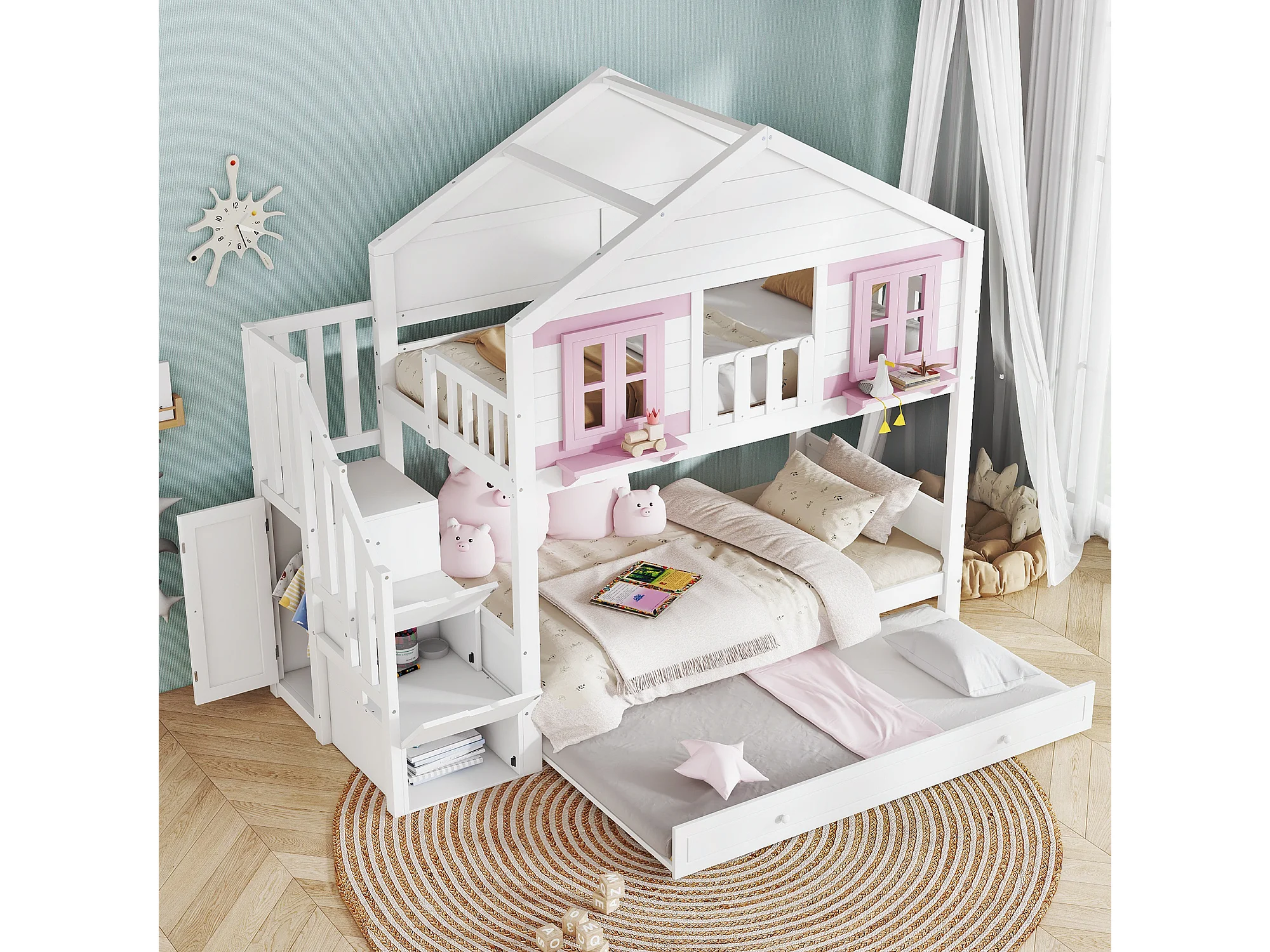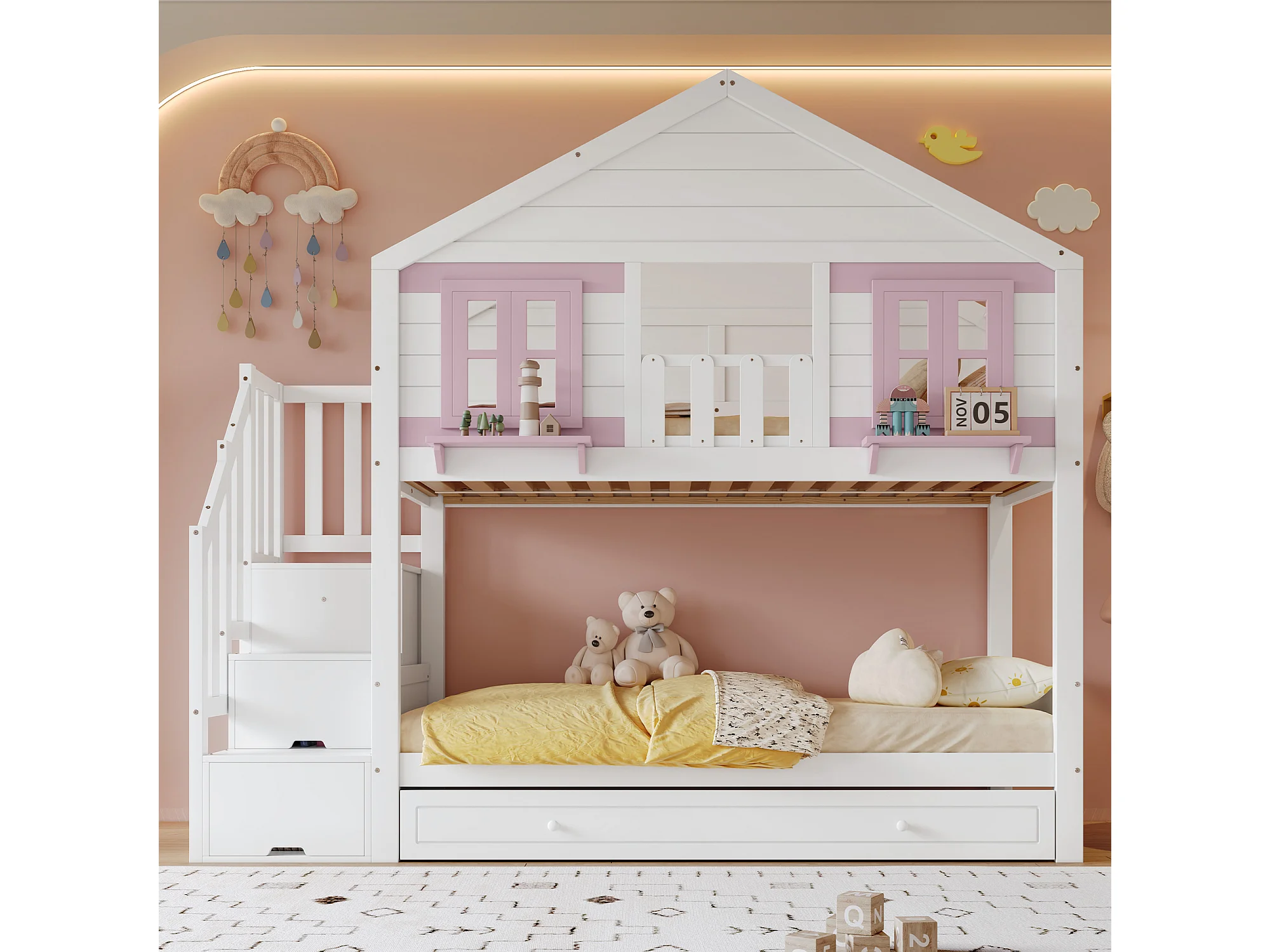 Litera con cama nido - 2 x 90 x 200 cm - con escalera de almacenaje + ventanas + techo - pino + MDF - blanco + rosa