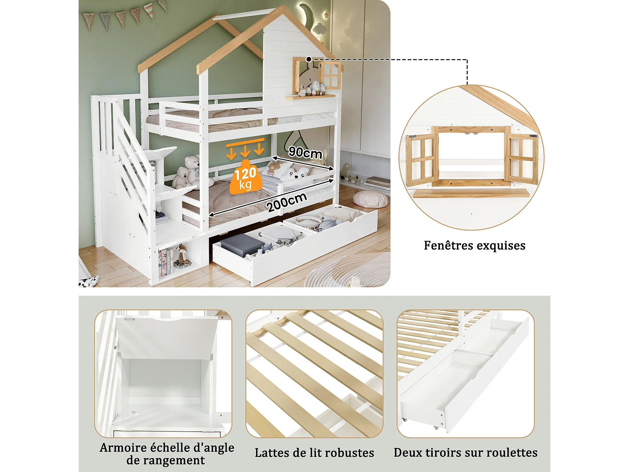 Litera con ventana, estantes y cajones, estructura de madera maciza y MDF, color blanco y natural (254 x 95 x 237,5 cm)