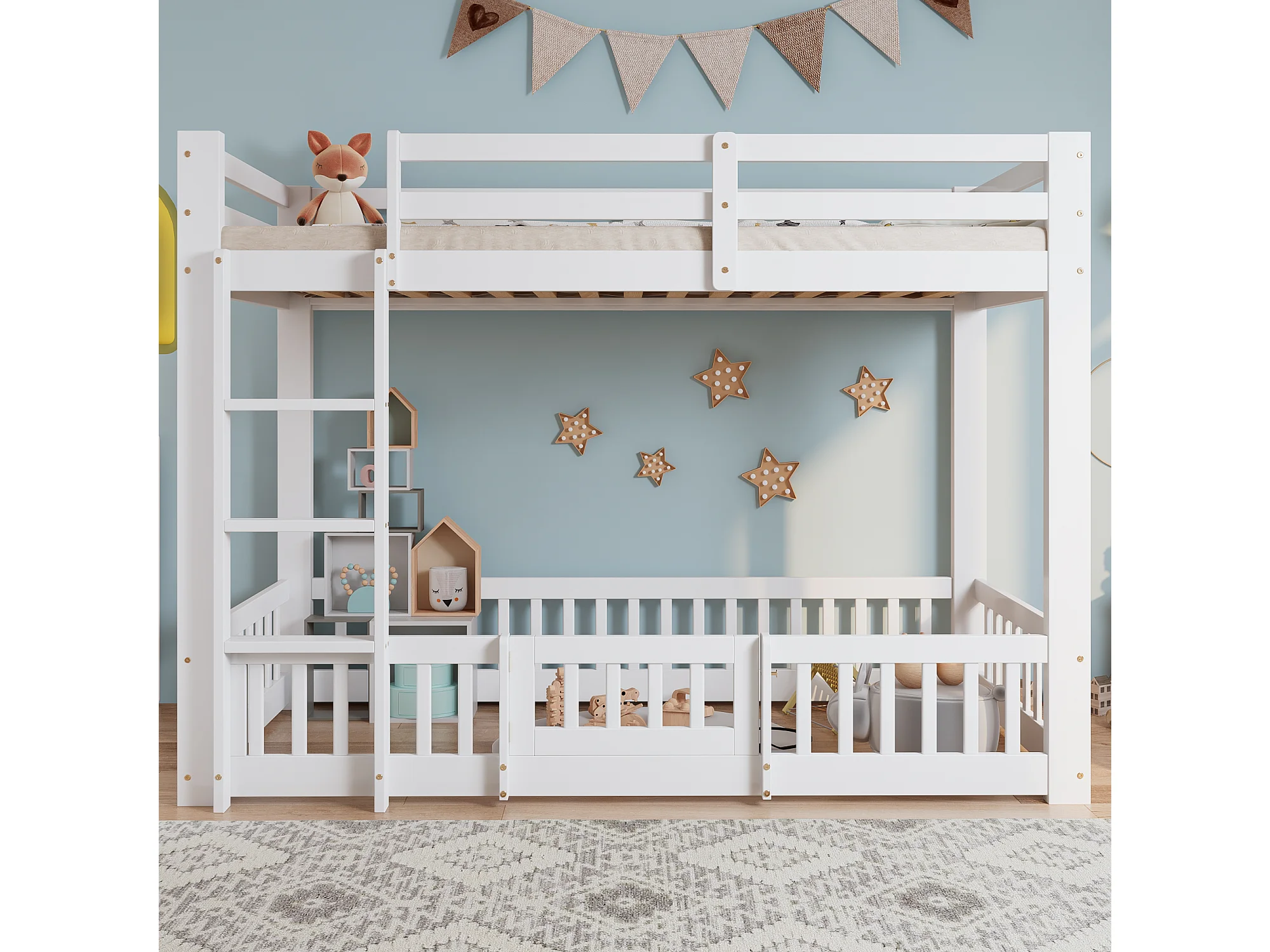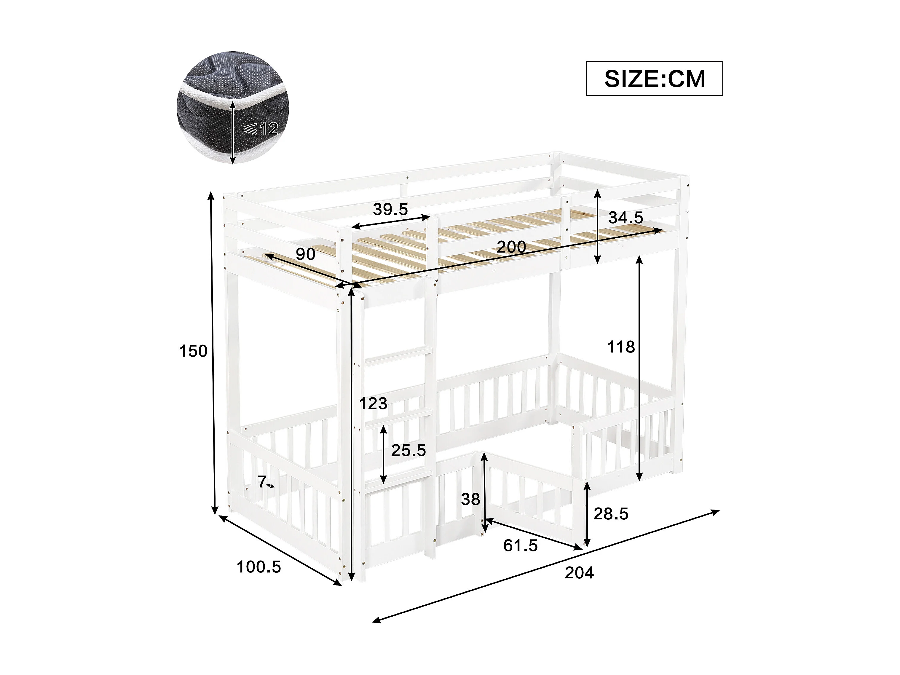 Litera de madera, con escalera recta, barandilla, puerta y espacio bajo la cama, Pino + LVL, Blanco (204x100,5x150 cm)