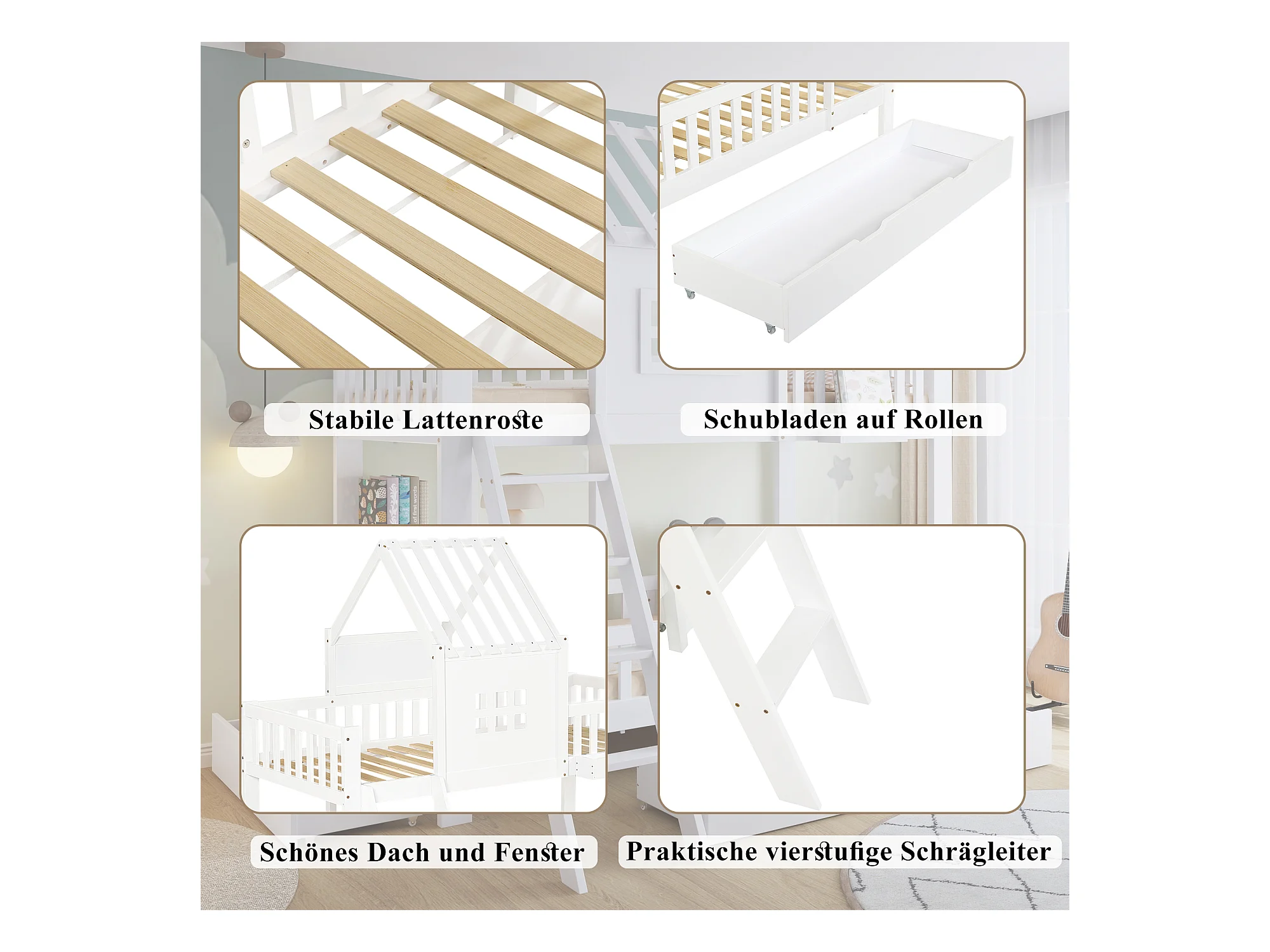 Litera infantil, 2 cajones, techo, ventanas, mesa de lectura, cesta, pino+MDF+CP blanco (205x152x225cm)
