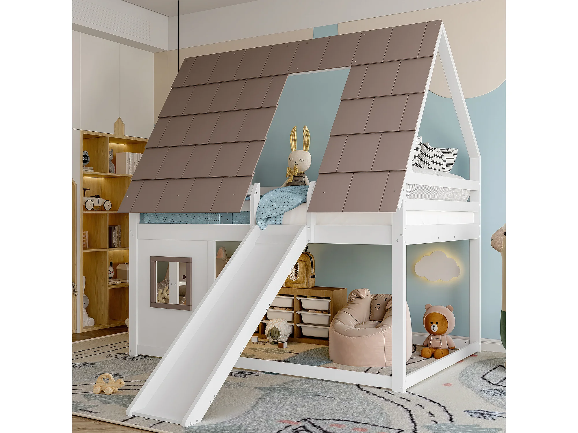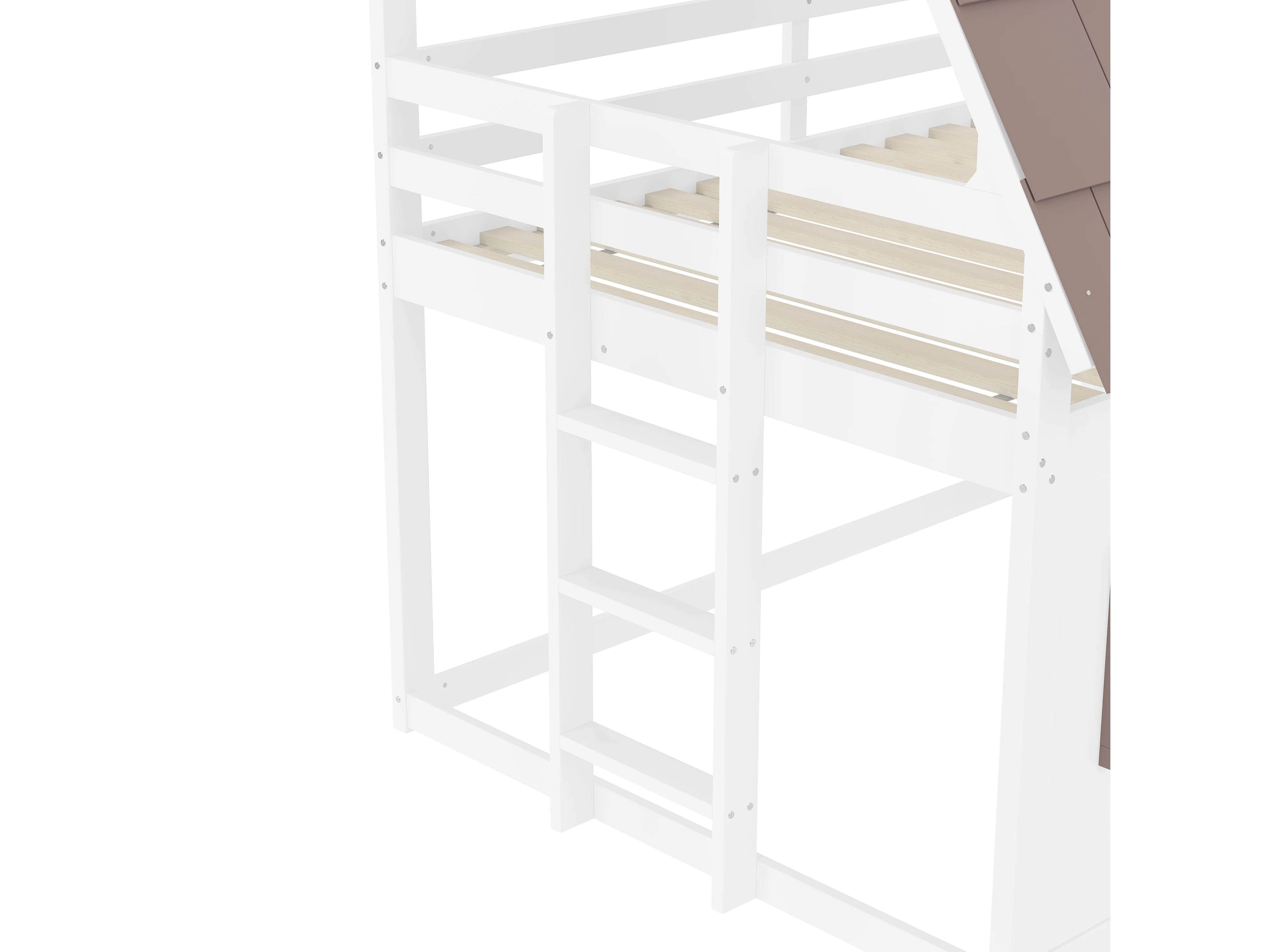 Litera infantil - 2 x 140 x 200 cm - con techo + escalera + tobogán - MDF + pino - blanco y marrón