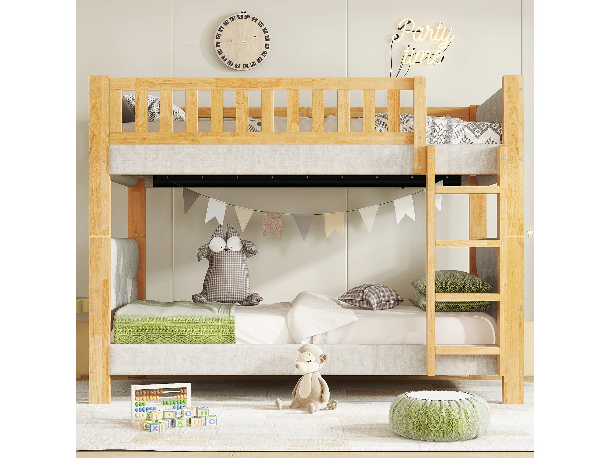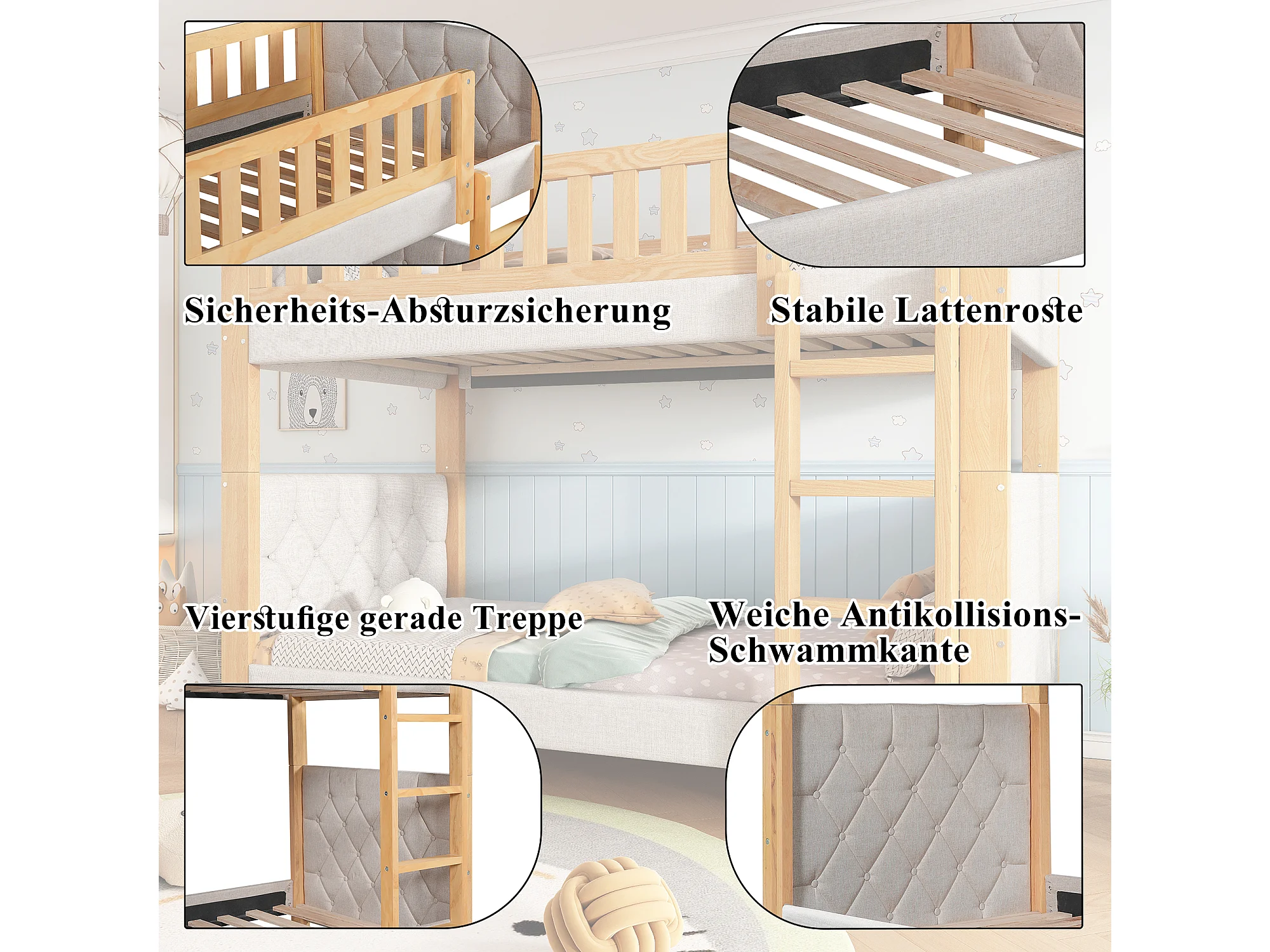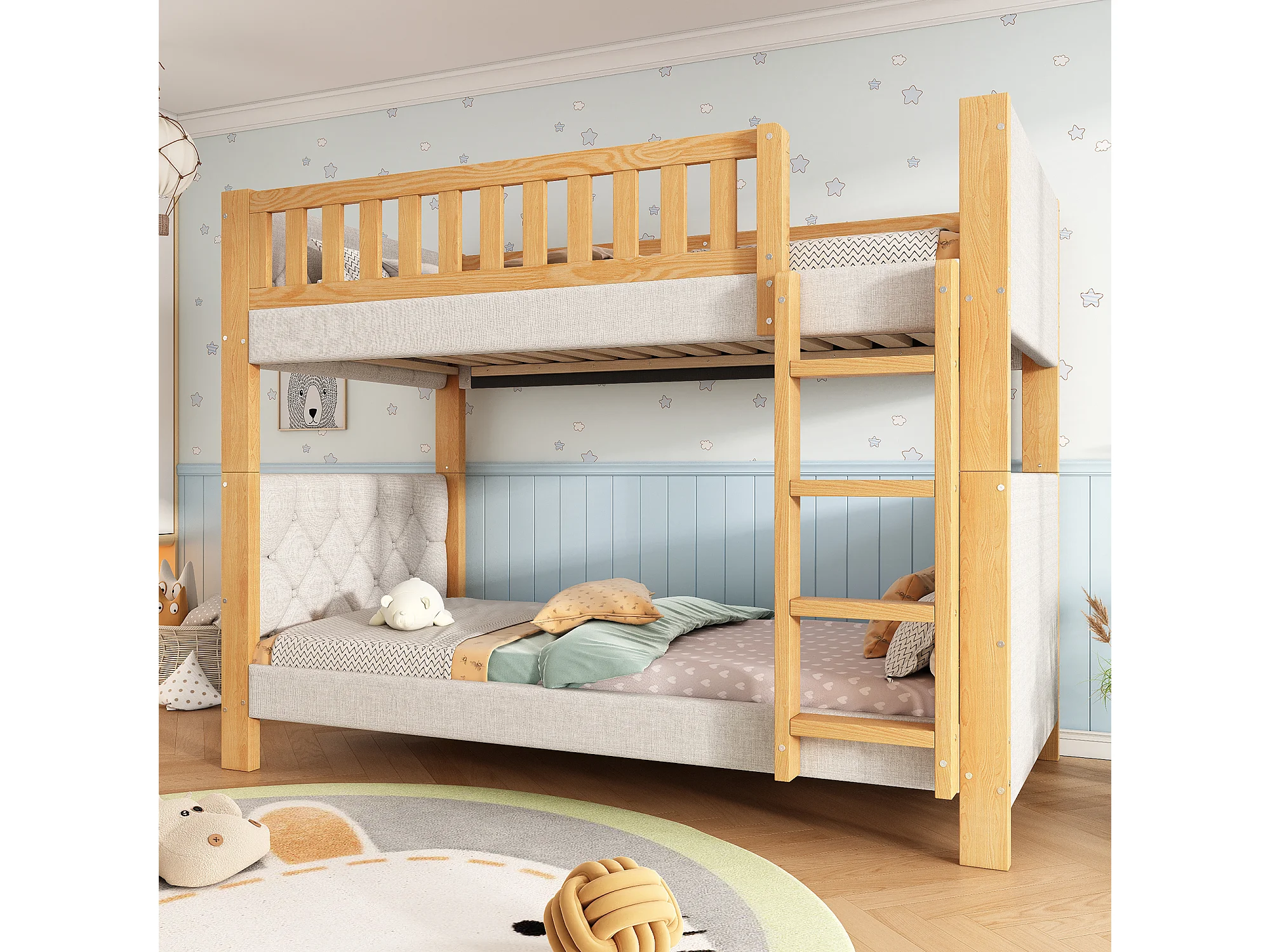Litera infantil - 2 x 90 x 200 cm - con bordes de espuma amortiguadora - madera + MDF - gris + natural
