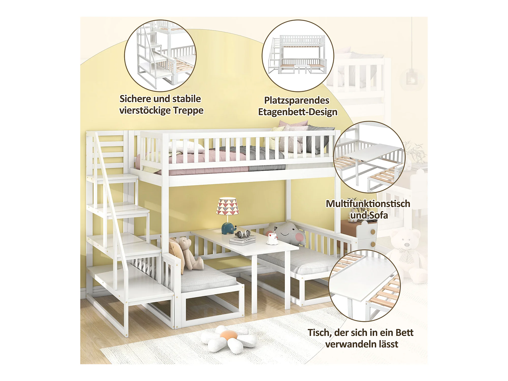 Litera infantil 90/120x200 cm multifuncional con 1 mesa ajustable y 2 sofás de madera - Blanco