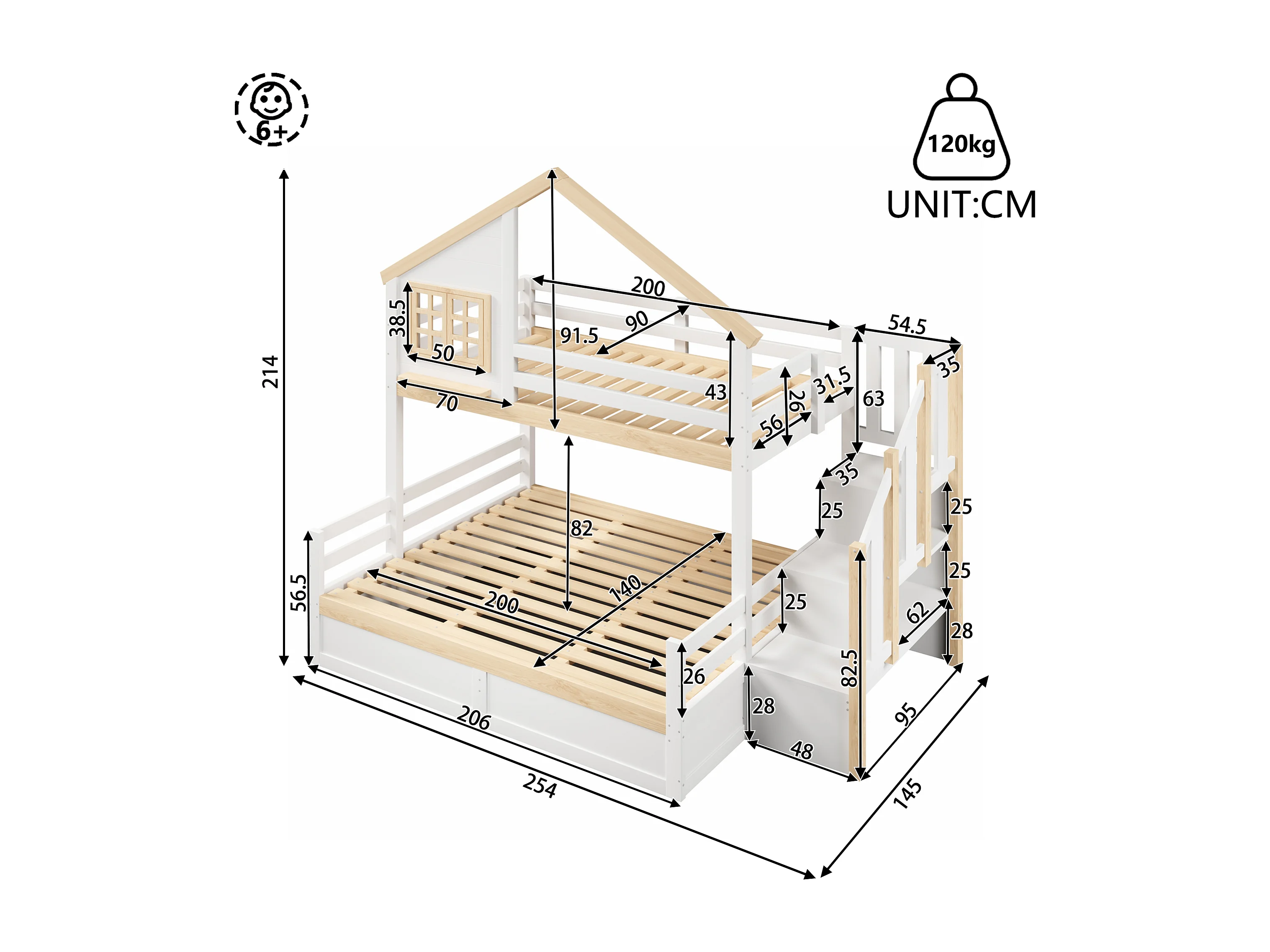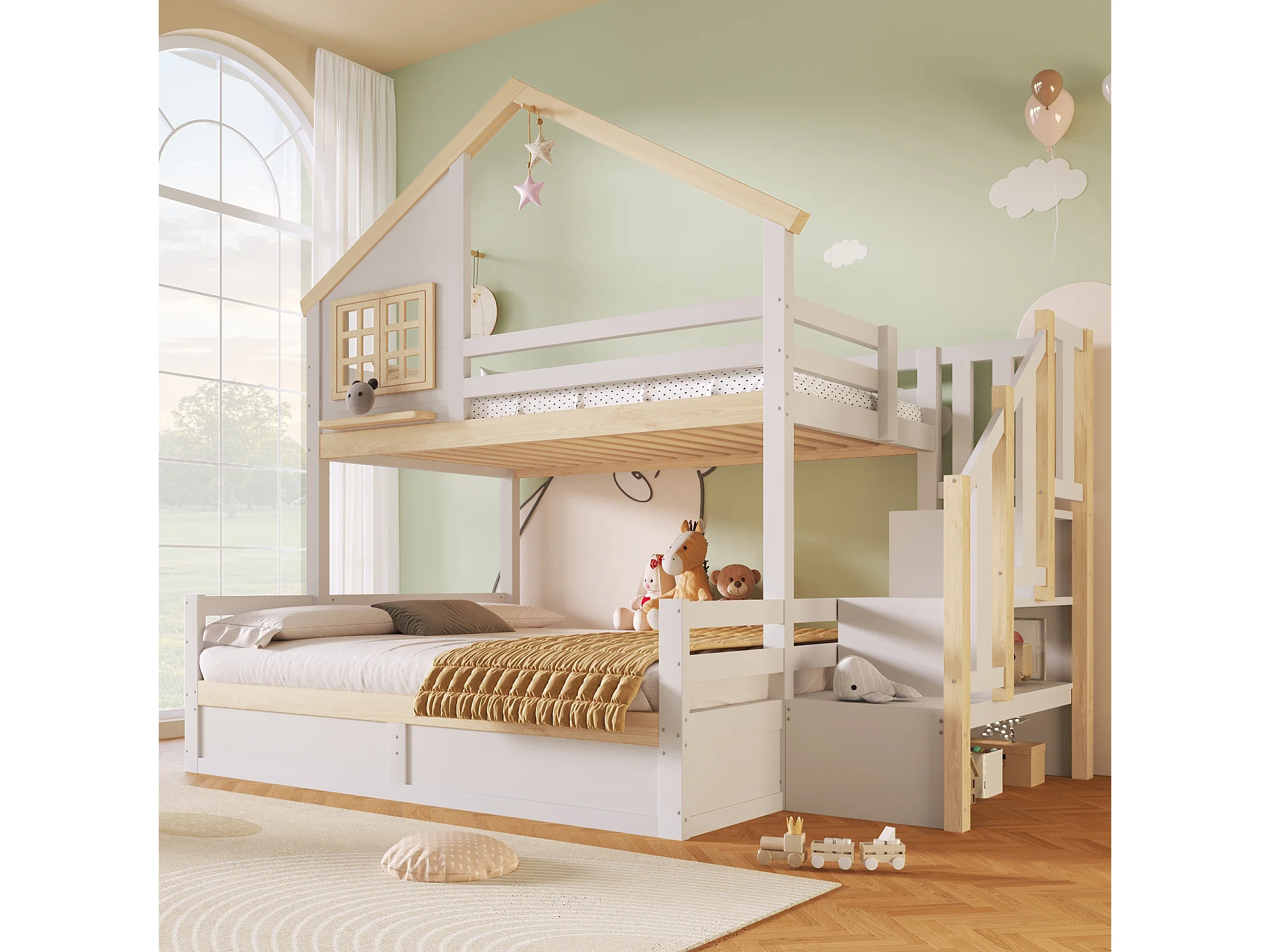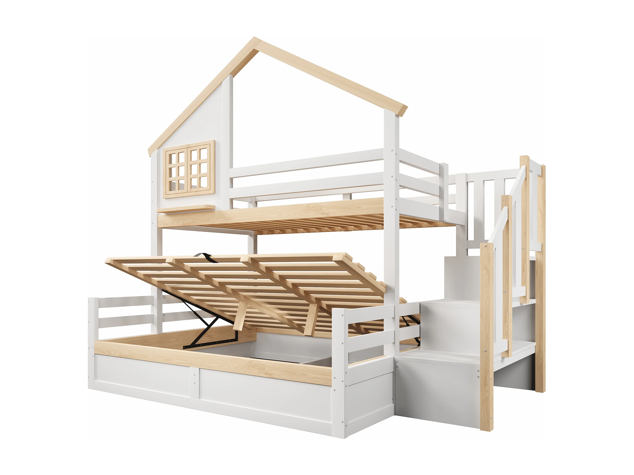 Litera infantil - 90 x 200 cm + 140 x 200 cm - con camas hidráulicas + escalera de almacenamiento - madera - blanca