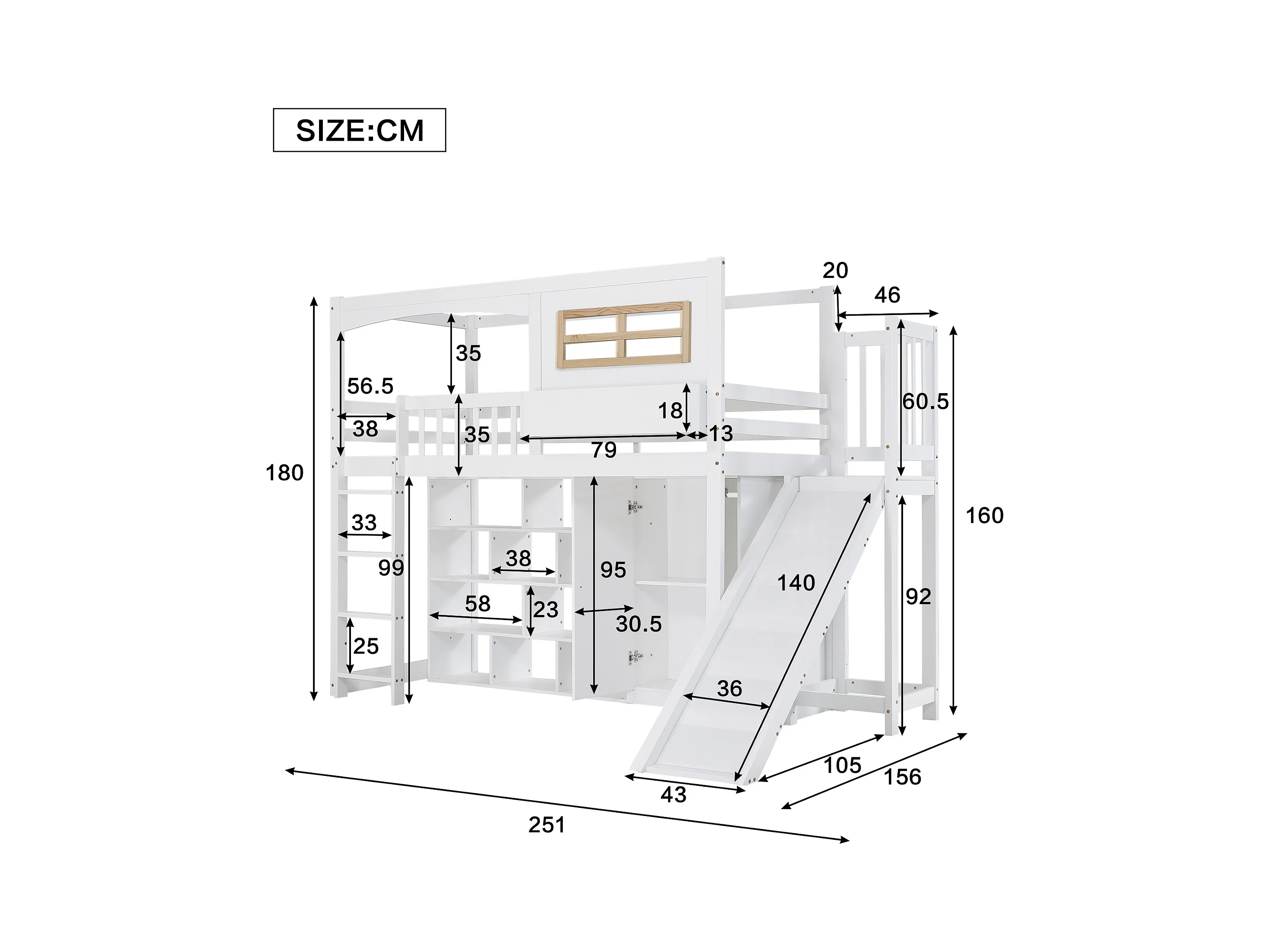 Litera cabina 90x200 cm en pino y MDF blanco/natural - Escalera con almacenaje, barreras, ventanas y techo