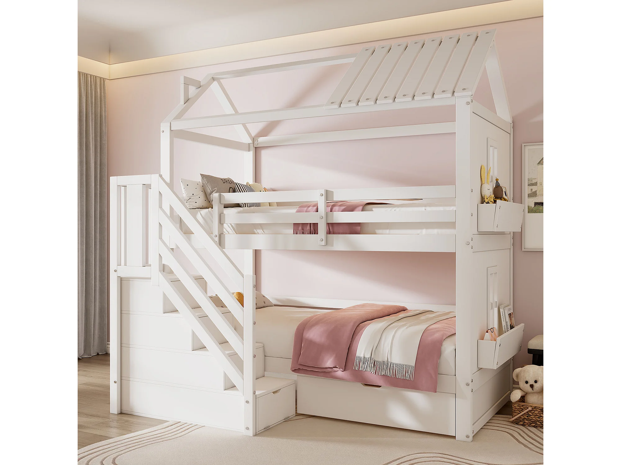 Litera infantil con techo, ventana, barandillas de seguridad, dos cajones con ruedas, estantes abiertos, blanco + rosa