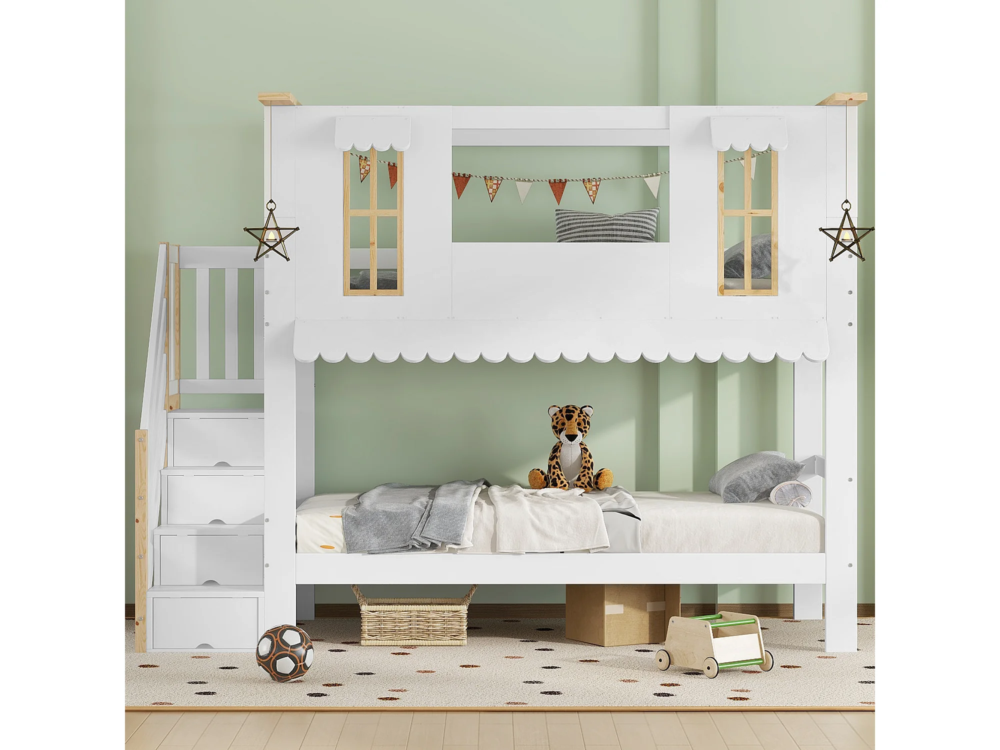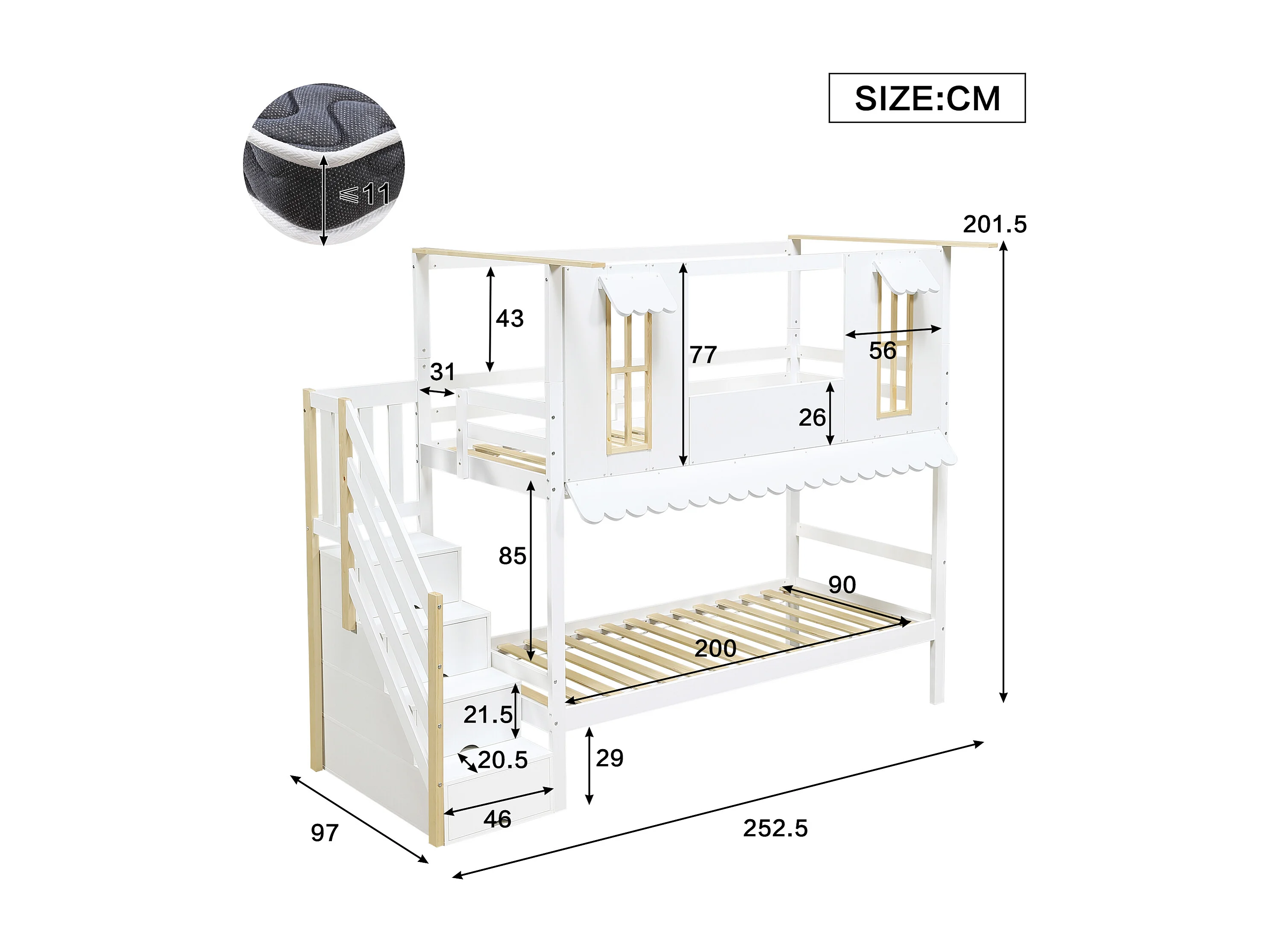 Litera infantil con escalera de almacenaje, ventanas decorativas y techo ondulado, pino + MDF, blanco + natural (252,5x97x201,5cm)