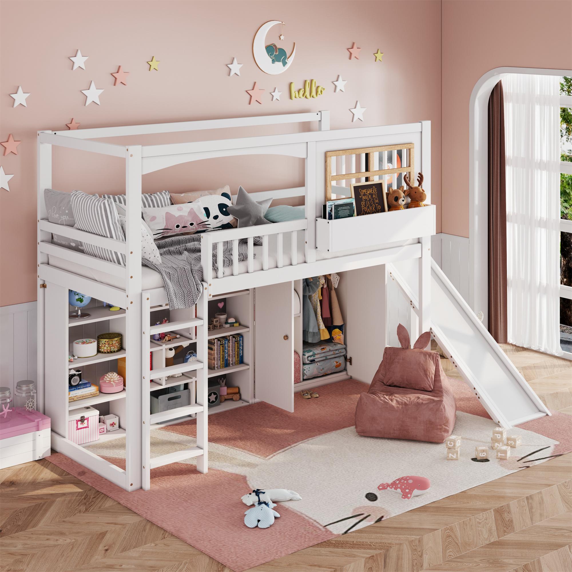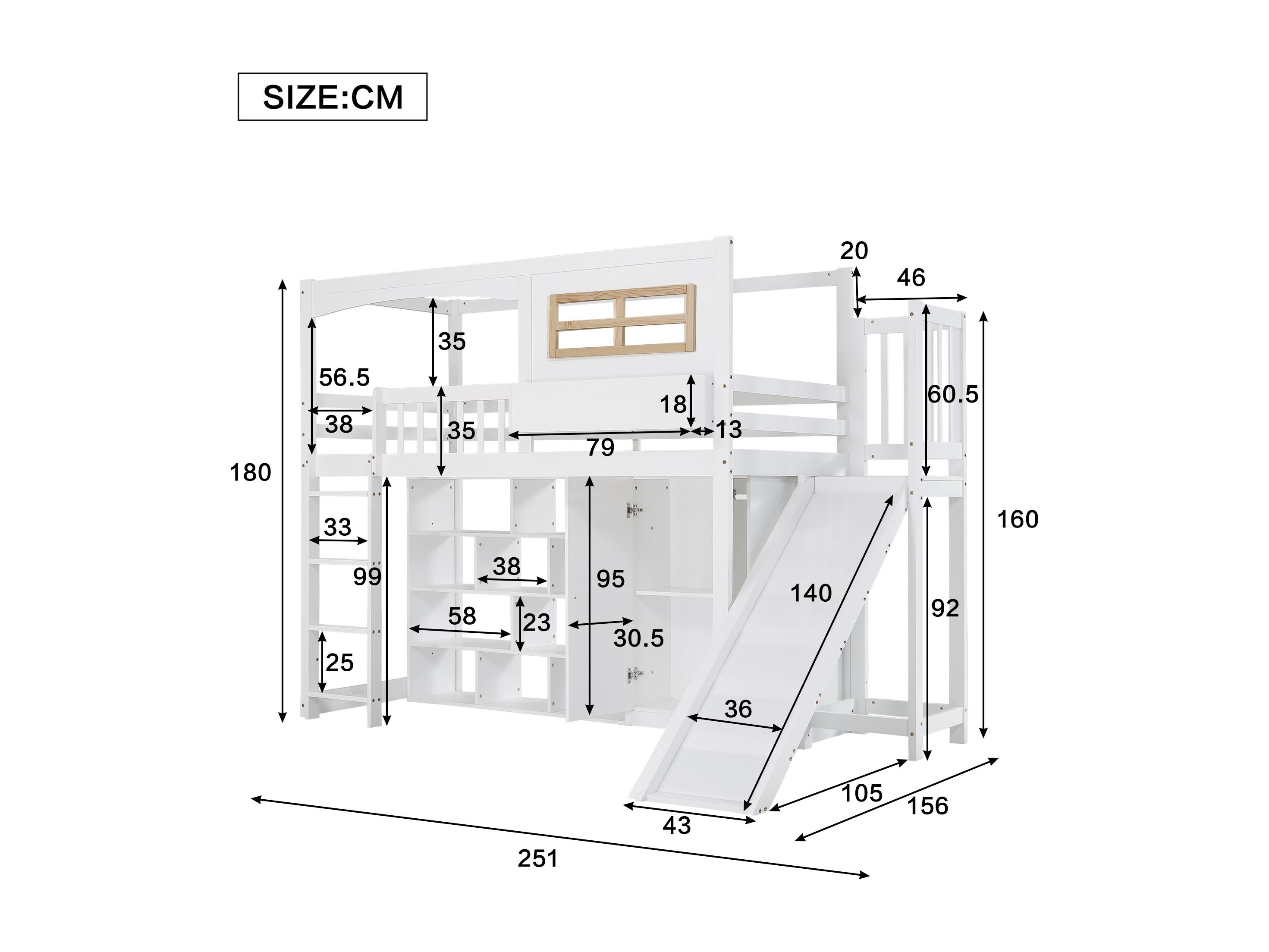 Litera de 90x200 cm y 140x200 cm con barandilla, tobogán, estantes y pequeña puerta escamoteable, color blanco, estructura de pino (242x163x159 cm) Producto