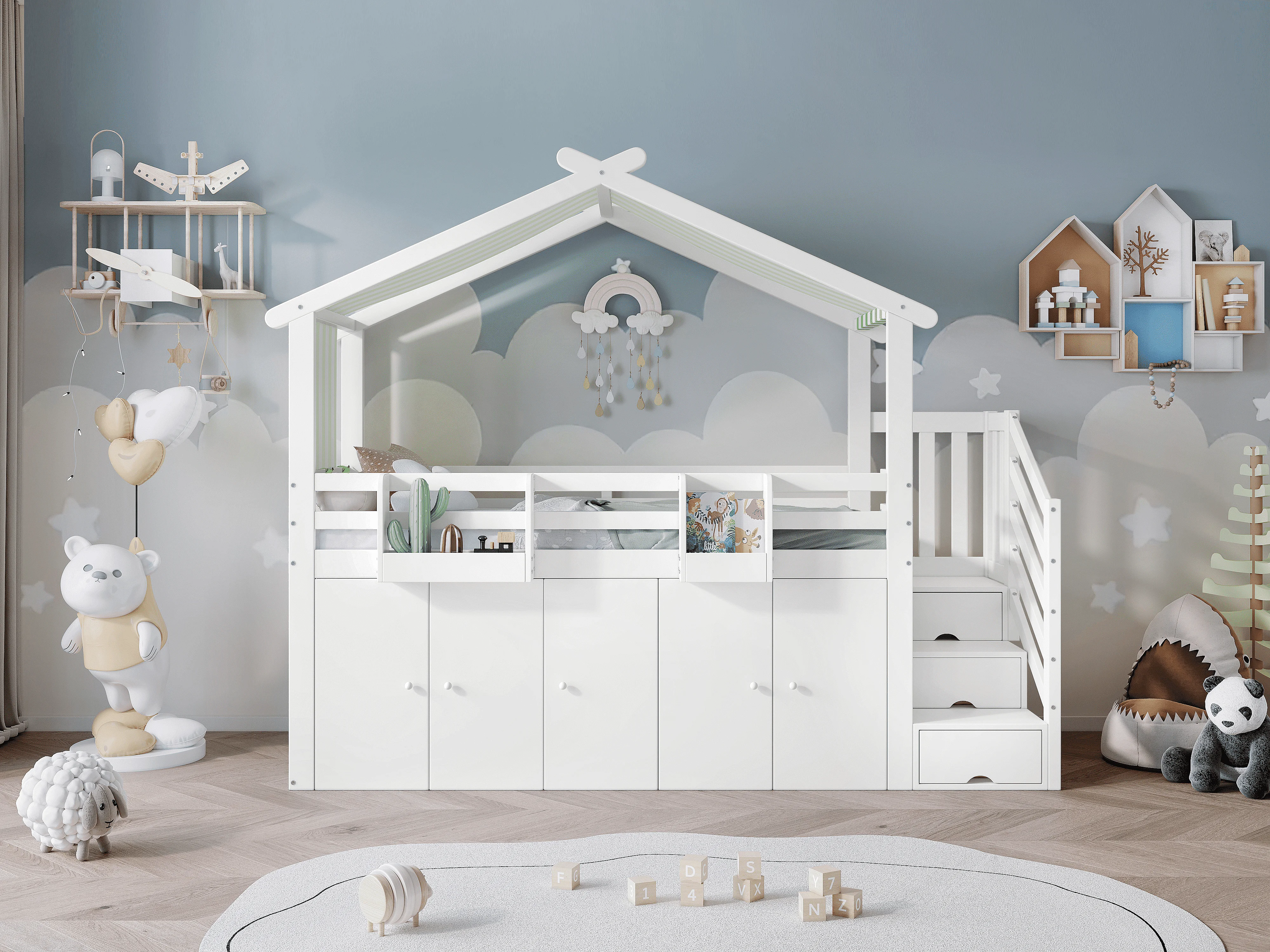 Litera infantil de 90x200 cm con barandilla y armario, Pino+MDF+Contrachapado, Blanco+Verde, Sin colchón