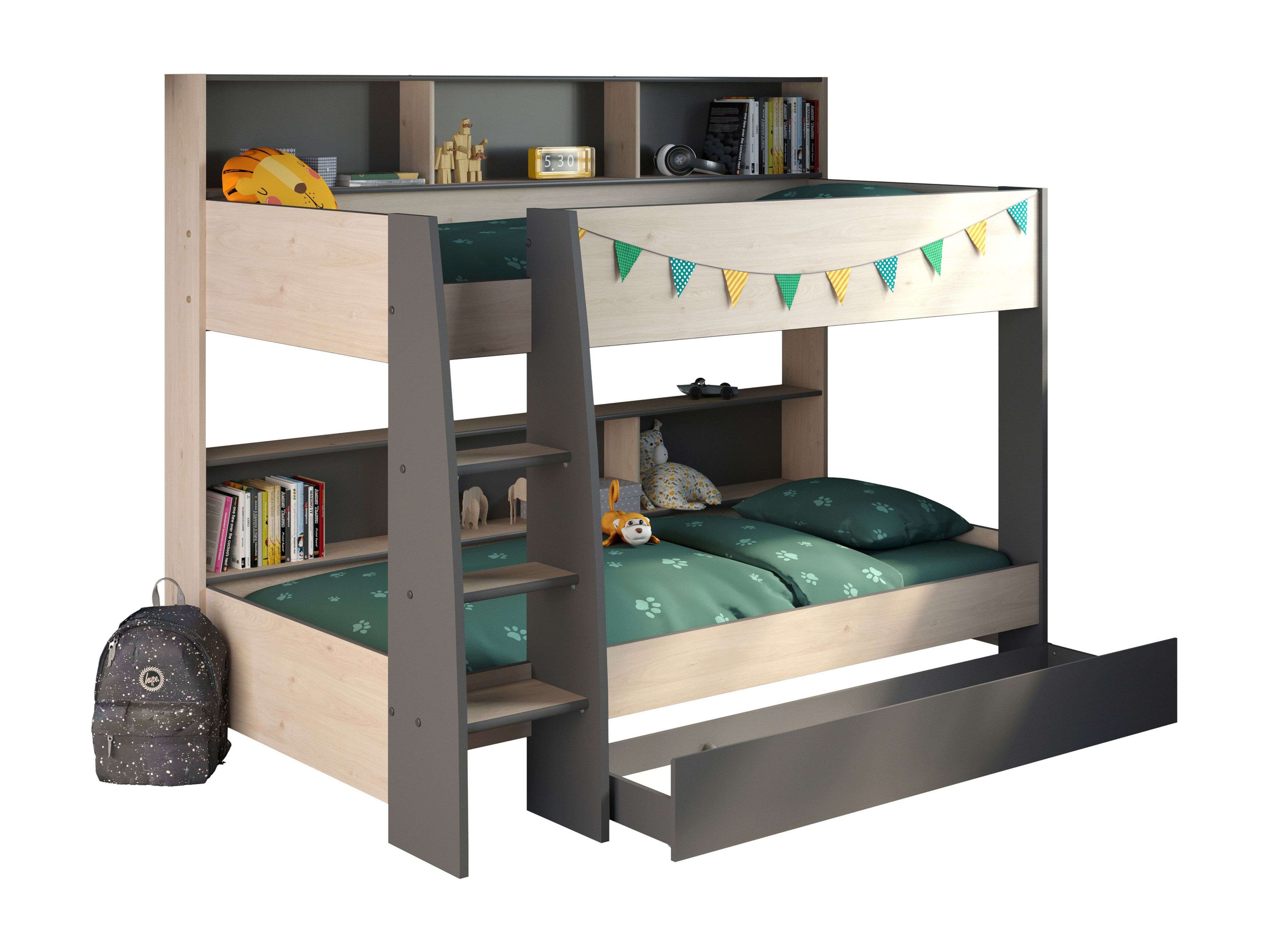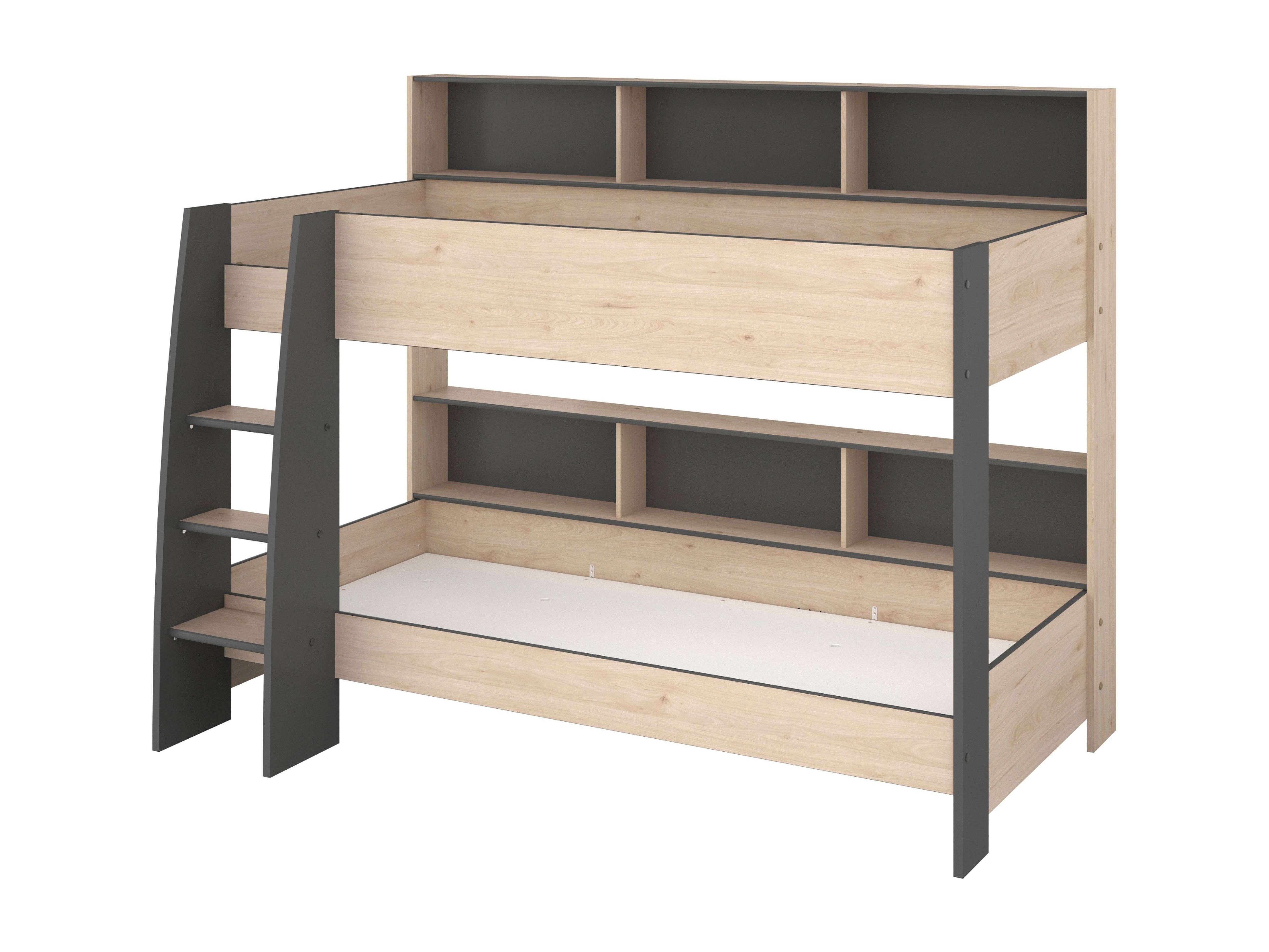 Incluye comodidad al dormitorio de tus peques con la litera Mouse en color roble Jackson y Gris oscuro. La estructura cuenta con tres estantes para cada cama que utilizarán como mesita de noche. Tus peques podrán usar esta cama en su infancia y juventud, porque su diseño se adaptará a sus etapas. Incluye dos bases que hacen la función de somier, tiene una escalera para que puedan subir a la cama superior. No lo pienses más, añade la litera Mouse al carrito. Fabricado en melamina. Compatible con colchones de 90x200 cm y colchones de 15 cm de alto para la cama superior, que no deberá sobrepasar la marca hecha sobre la cama superior. Si se quiere poner un colchón más alto, es recomendable instalar una barrera de seguridad (no incluida). Se recomienda que la parte superior de la litera no sea utilizada por niños menores de 6 años. No se incluyen colchones, otros muebles ni los elementos decorativos de las imágenes. Medidas: Litera: Alto 164 cm Ancho 207 cm Profundidad 132 cm Estantes litera (individual): Ancho 67 cm Profundo 27 cm Carga máxima por cama recomendada: 80Kg. Se recomienda seguir las instrucciones de montaje. Se trata de mobiliario con kit de montaje, que incluye manual de instrucciones y tornillería. No se garantizan envíos a Menorca, Ibiza y Formentera.No se garantizan envíos a Menorca, Ibiza y Formentera. Las entregas se realizan a pie de calle