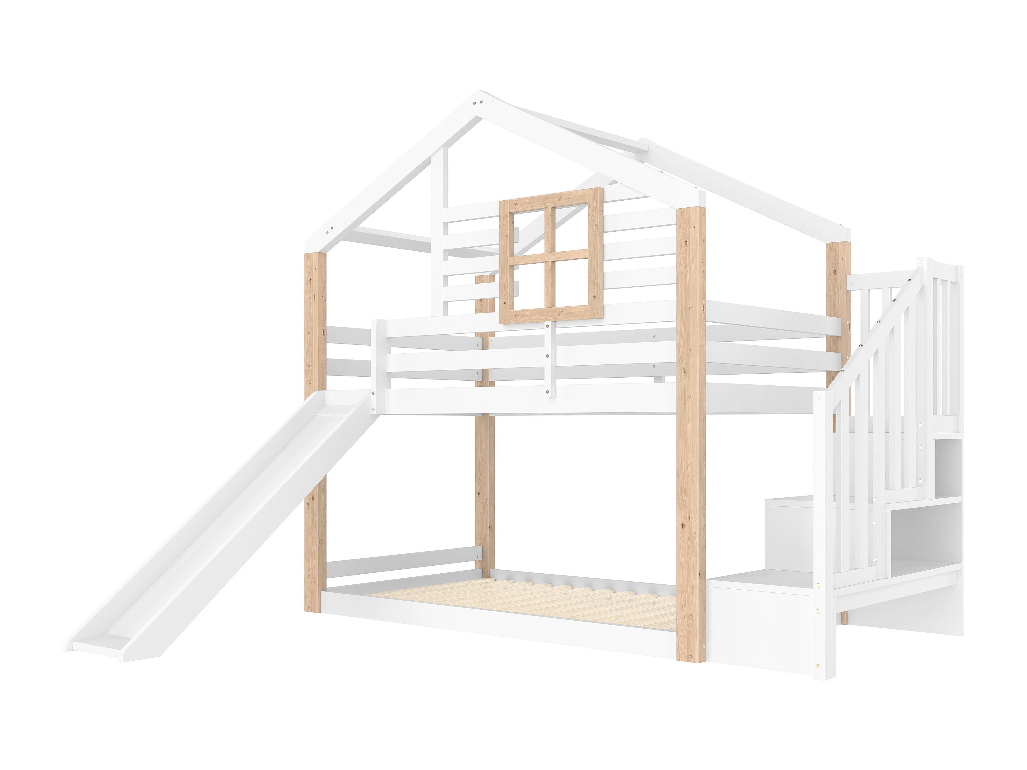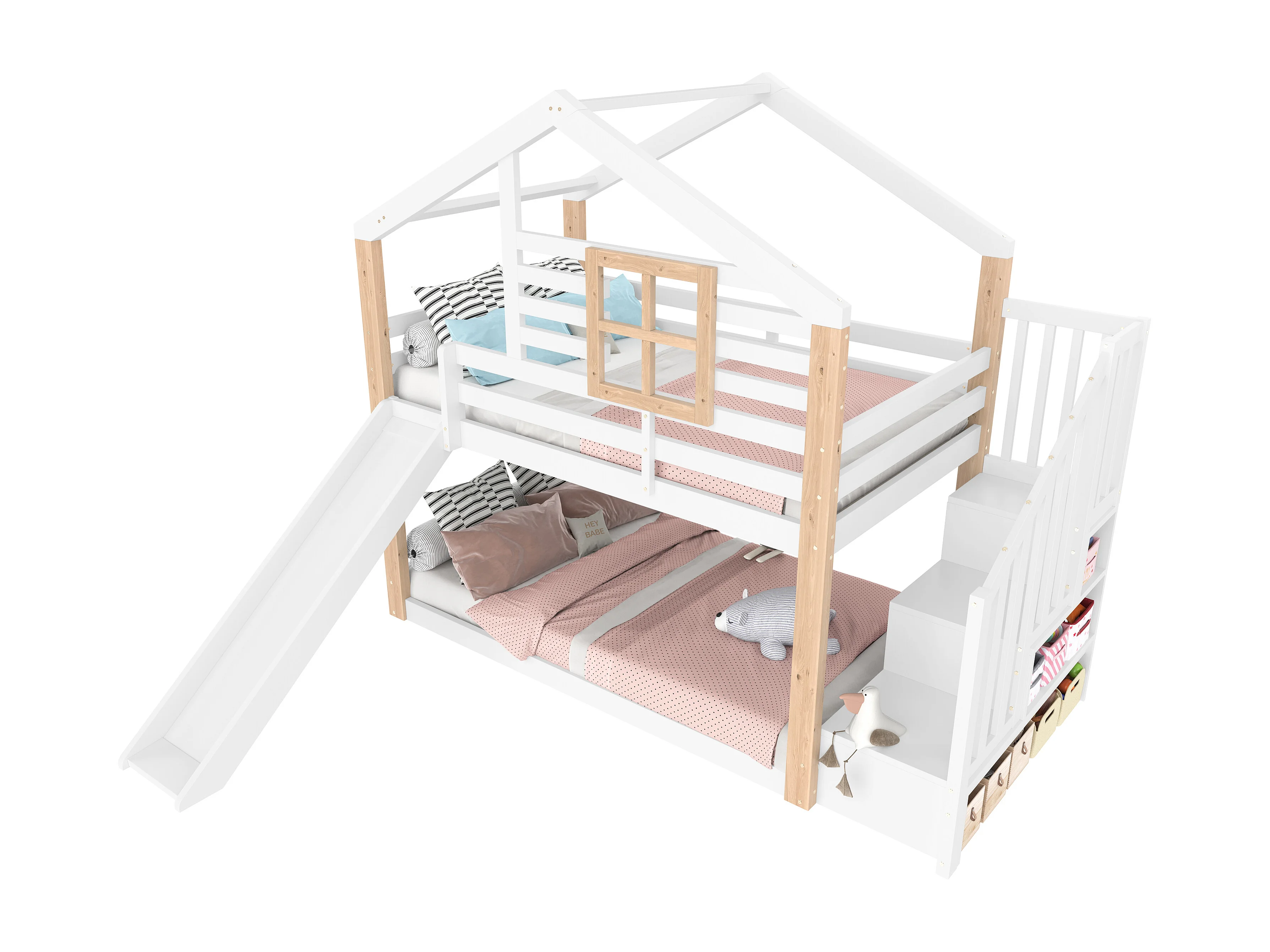 Litera infantil blanca de 90x200cm con escalera de almacenaje, tobogán, ventana, sin colchón