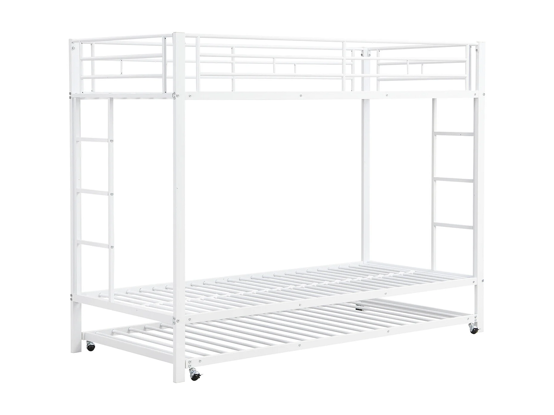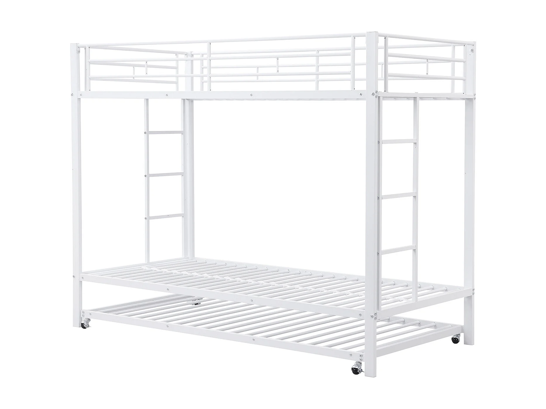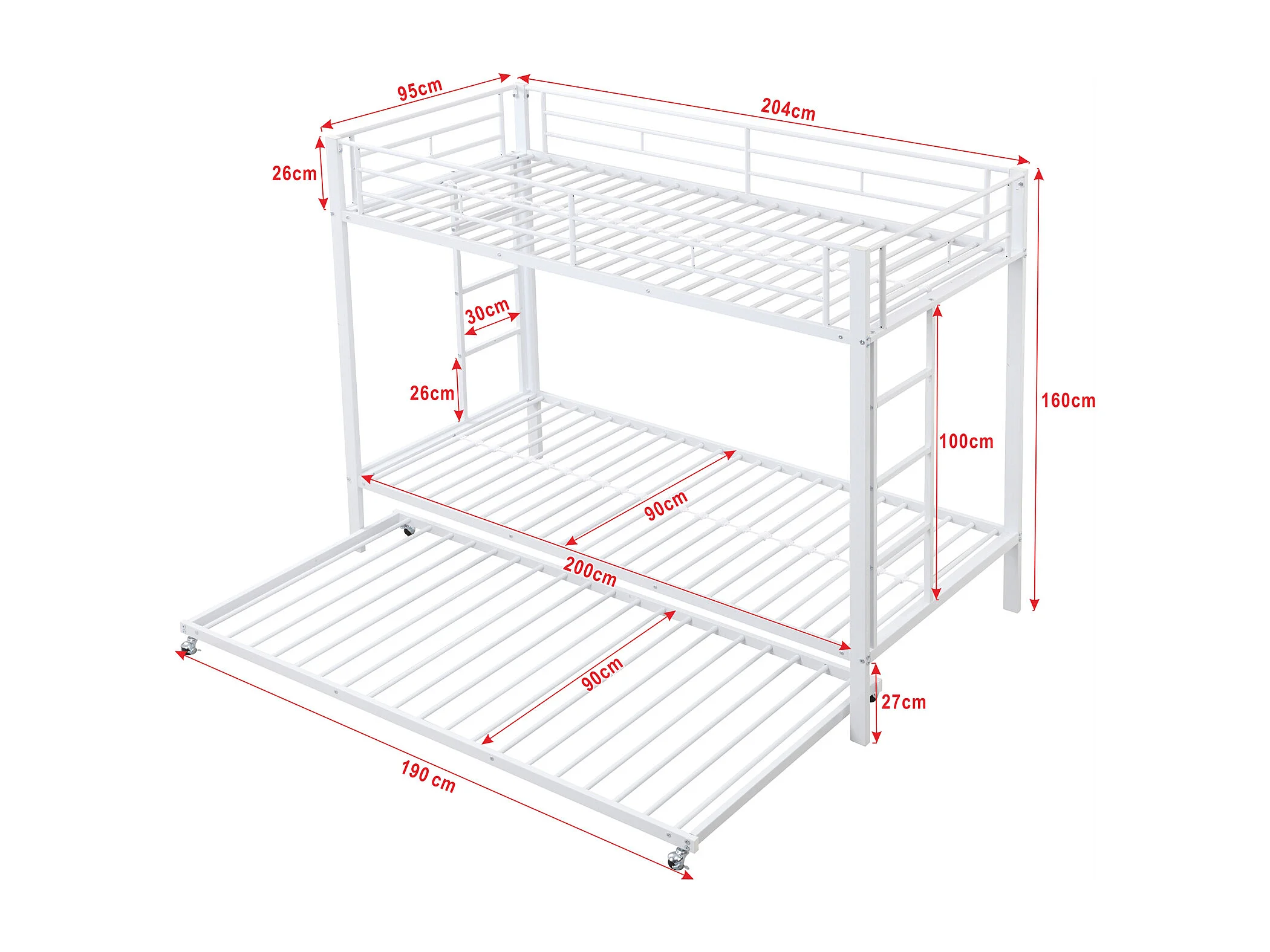 Litera triple blanca (90x200 cm) para niños, con cama nido, barandillas altas y escalera segura.
