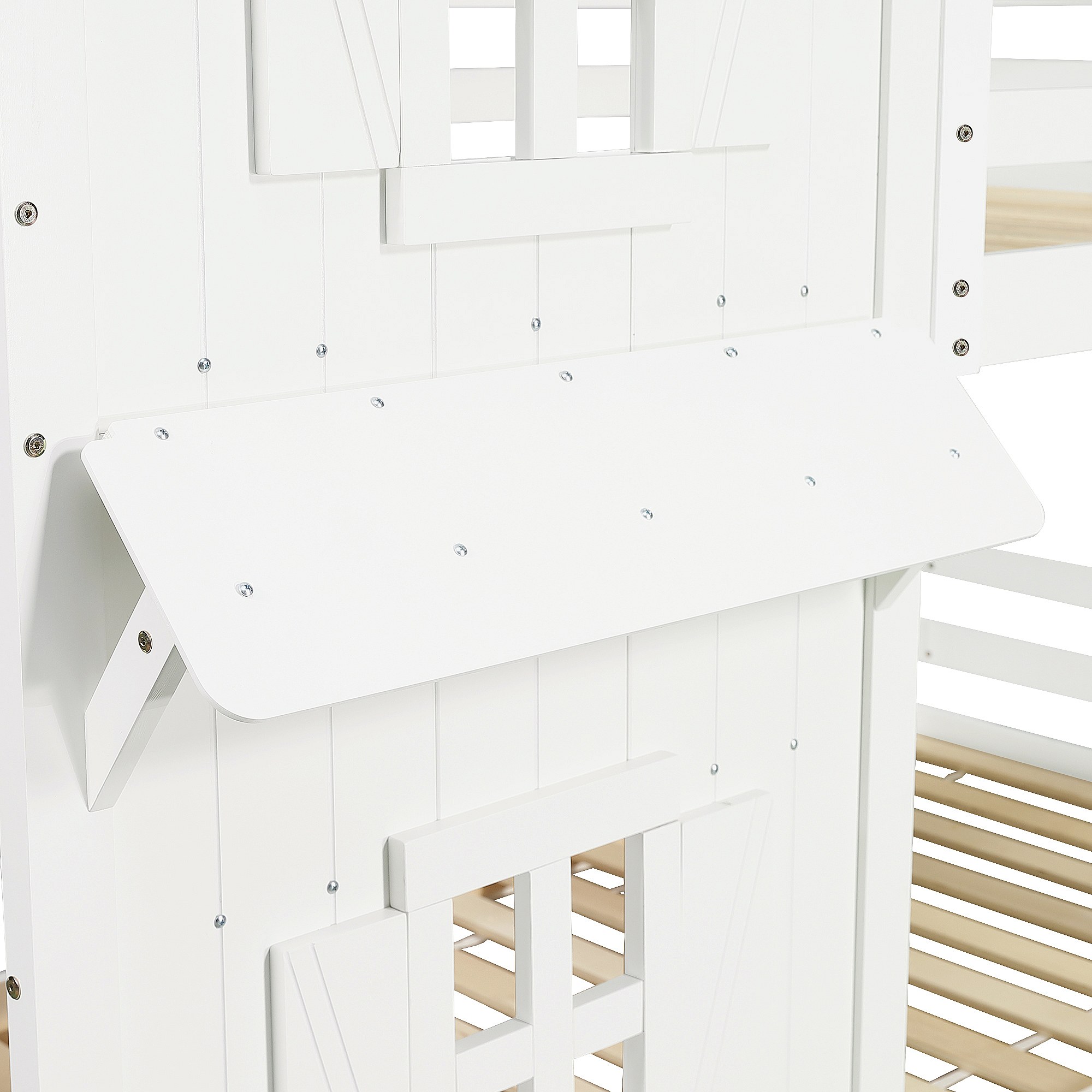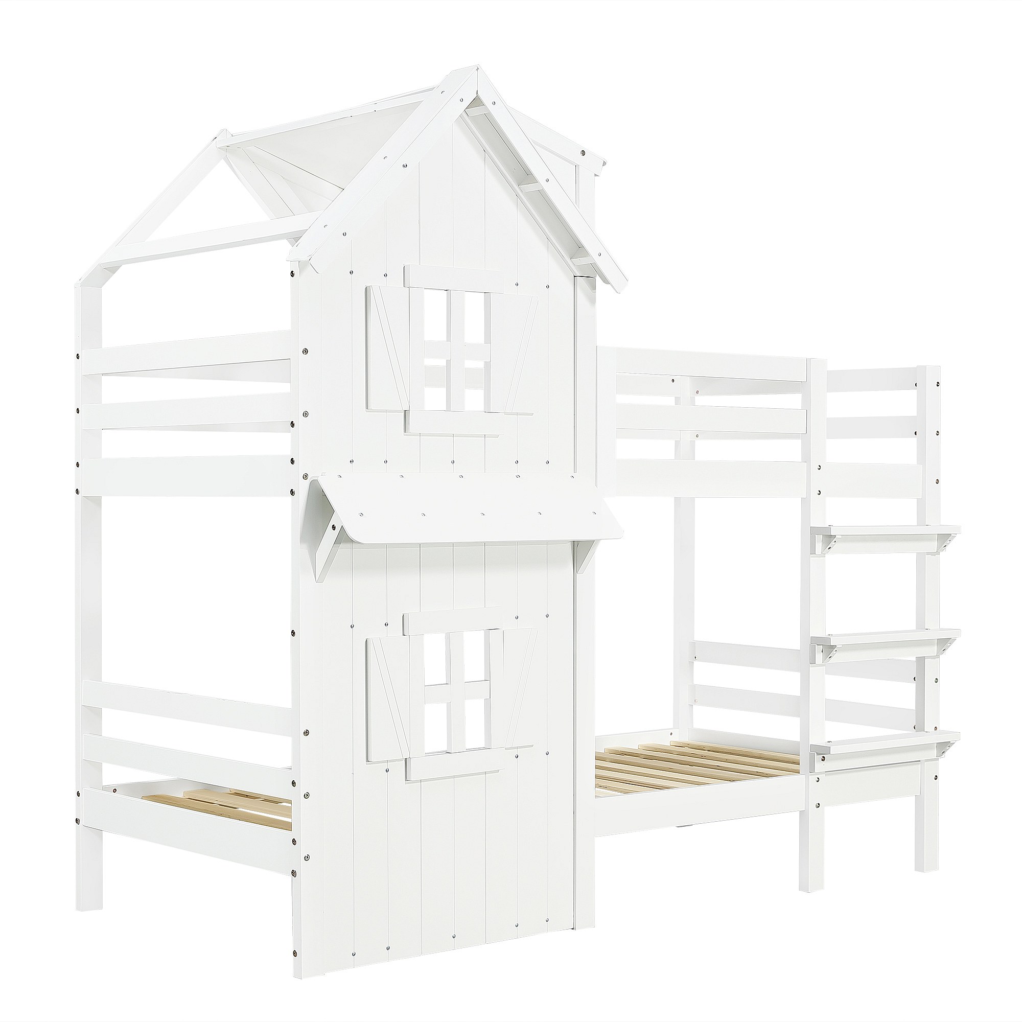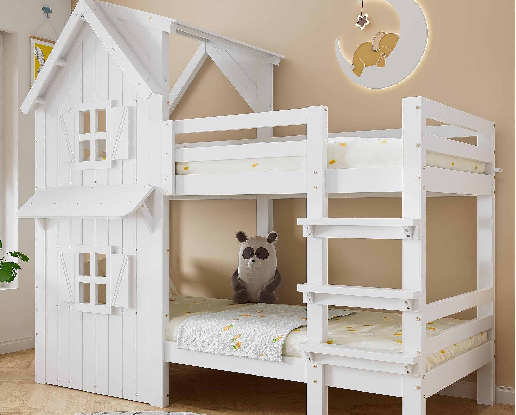 Literas infantiles 90x200 cm - con bonitas ventanas y techo - con escalera de 3 peldaños - madera maciza + MDF + contrachapado - Blanco